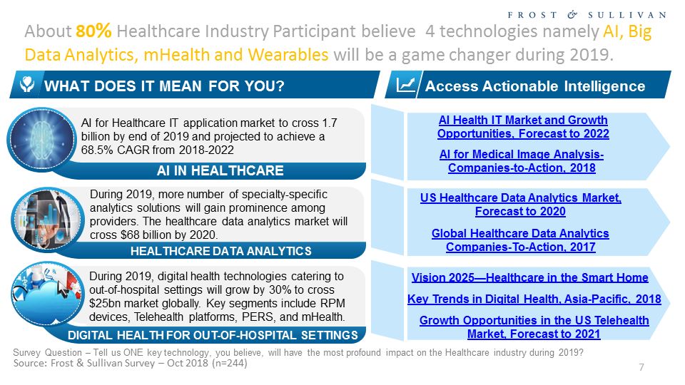 Frost & Sullivan还预测,未来的药物和设备研发投资将更加具有针对性,以满足亚洲新兴市场的独特需求。而近十年来医疗领域大肆炒作的两大技术:人工智能(artificial intelligence, AI)和区块链(blockchain),将在2019年迎来现实落地的考验。 此外,有近80%的医疗行业从业人员认为,人工智能、大数据分析、移动医疗和可穿戴设备这四项技术将在2019年改变医疗行业的发展。