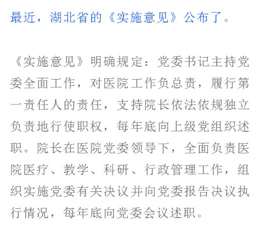 2018年6月,中共中央办公厅印发《关于加强公立医院党的建设工作的意见》(以下简称《意见》),明确提出,公立医院实行党委领导下的院长负责制。要求各地区各有关部门要结合实际,于2018年8月前制定贯彻落实本意见的实施办法。