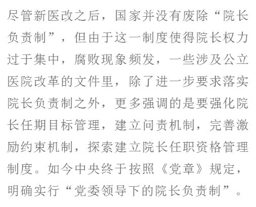 尽管新医改之后,国家并没有废除“院长负责制”,但由于这一制度使得院长权力过于集中,腐败现象频发,一些涉及公立医院改革的文件里,除了进一步要求落实院长负责制之外,更多强调的是要强化院长任期目标管理,建立问责机制,完善激励约束机制,探索建立院长任职资格管理制度。如今中央终于按照《党章》规定,明确实行“党委领导下的院长负责制”。