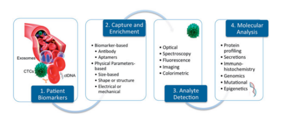 以新型生物芯片为代表的自动化智能型医疗技术从肿瘤诊疗研究走向早期诊断及动态监控等临床应用,成为精准医疗时代的重要组成。其中,液体活检是最重要的研究领域之一,在癌症早筛、预后监测、用药指导、患者分层等领域均表现出十足的潜力,出现了大批重要临床结果。 2018年已近尾声,纵览一年液体活检助力精准医疗技术更迭蜕变,美晶医疗微流控芯片专利技术产品—CellRichTM系统,于年初获CFDA认证批准,作为循环肿瘤细胞(CTC)检测新锐技术产品,展露锋芒,临床与科研项目开展齐头并进,未来可期。此外,该系统作为体外免疫诊断领域的一种新的检测平台,可以实现各种免疫磁微粒复合物(如细胞、蛋白及核酸等)的特异性分离及捕获,有望实现液体中外泌体和ctDNA的提取与分析。 液体活检:应运而生的精准医疗前沿 在精准医学的时代背景下,液体活检技术应运而生,与传统组织活检相比,液体活检更能反映肿瘤整体、实时的信息,甚至是全身肿瘤的信息,因此其在肿瘤辅助诊断、疗效评估、病情监测及预后评估等方面显示出独特的优势。随着检测技术的不断完善,液体活检的三大领域CTC、外泌体和ctDNA,在肿瘤精准医疗的临床应用各放异彩。 图1 液体活检的概念与流程 微流控技术:芯片助力液体活检 微流控芯片技术是一种在微米或纳米尺寸级别下处理或操纵液体的技术手段,由多个不同的操作单元组成,具有通量高、耗时短、耗材少、可控性强等优势,从而优化检测过程,实现自动化检测,是分析化学、细胞生物学、遗传学等诸多研究领域的重要技术平台。在生物技术研究领域,微流体技术为生物大分子(如蛋白质),小分子(如核酸)等很多标准生物分子检测,如酶联免疫吸附测定(ELISA)、聚合酶链反应(PCR)以及逆转录PCR(RT-PCR)等提供了全新的自动化技术平台。微流控芯片技术已经能够成功地进行液体活检领域(CTC/ctDNA/外泌体)的分析,并实现成果转化,走进产品商业化进程,为临床服务。 下面,我们就来了解一下微流控芯片上的液体活检技术。 循环肿瘤细胞(CTC): 检测日趋成熟 循环肿瘤细胞(CTC)是从肿瘤组织脱落进入外周血的各类肿瘤细胞的总称,是液体活检领域临床研究热度最高的生物标志物。其临床应用价值逐渐得到临床承认,并已先后被写入AJCC癌症分期手册(2010、2018)及乳腺癌NCCN指南(2017.V3)。与此同时,随着微流控技术在液体活检平台应用的不断推进, CTC检测技术也出现了跨越式的发展。在物理学方法上,自根据肿瘤细胞物理学特性通过膜过滤、密度梯度离心等方法进行细胞的粗分离,已发展到基于微流控检测技术的力学、介电泳、大小及变形力等多类型高集成度的富集方法;在免疫学方法上,自单纯的利用免疫磁珠法富集CTC(anti-EpCAM等正向捕获法或anti-CD45等负向富集法),发展到在基于微流控纳米芯片上实现免疫磁珠法的CTC高效分离。 美晶医疗CellRichTM系统是经过中国国家食品药品监督管理总局(CFDA)批准的基于微流体芯片的可融合正、负双向分离方法结合免疫荧光原位杂交技术的检测平台,用于恶性肿瘤疾病管理的CTC检测。并且,随着检测技术的不断改进,CTC检测的应用已不仅仅局限于计数,美晶医疗在高效捕获CTC基础上已建立了多肿瘤标志物、单细胞分析及细胞表达量等相关检测方法,为进一步分析CTC携带的肿瘤基因、蛋白等下游相关组学信息提供技术支持。 ![]() 图2 CellRichTM循环肿瘤细胞检测系统 近年来的临床研究结果不断刷新并证实CTC计数在肿瘤患者的辅助诊断、预后评估、疗效评估及复发/转移风险评估的应用价值。2018年权威学术杂志《Journal of Clinical Oncology》上发表的由美国多中心联合开展的研究结果,入组6081名转移性去势抵抗性前列腺癌(mCRPC)患者,以基线和治疗后13周后CTC计数和PSA水平的一系列变化作为疗效评价指标,结果表明CTC0(基线CTC≥1,13周后CTC=0)和CTC conversion(基线CTC≥5,13周后CTC≤4)这两个指标可用于评估mCRPC患者疗效及预测预后。但是,CTC的应用价值不止于此,基于CTC的下游分析具有更广泛的前景,如在DNA、RNA、蛋白质水平进行更全面、更深入的分析,为个性化用药及药物研发提供指导意义。来自哈佛医学院的Miyamoto等使用微流控芯片CTC富集技术从前列腺癌男性的血样本中单独分离CTC细胞并进行单细胞RNA测序分析,寻找病人内和病人间的异质性,及它们与初期肿瘤样本的不同之处,揭示了前列腺癌的耐药机制。Yu等从雌激素受体阳性(ER+)的乳腺癌患者血液中,分离CTC,并通过体外培养建立了细胞系。研究发现CTC与原发肿瘤细胞具有相同的组织学和免疫组化特性;CTCs细胞系基因测序结果显示CTCs与实体肿瘤保持着一致的遗传特性,但又拥有一些新的遗传突变,CTCs存在PIK3CA基因突变和新获得的突变基因ESR1和FGFR2;进一步对具有多个突变的CTC细胞系进行药物敏感性实验发现CTCs对紫杉醇和卡培他滨敏感,对氟维司群、阿霉素和奥拉帕尼耐药;动物实验研究发现5株CTCs细胞系中有3株在小鼠上具有致瘤性。以上结果表明CTC体外培养,为药物筛选提供有效方式。 外泌体(exosome):液体活检的风口浪尖 外泌体是一种由细胞分泌的,直径一般为 30-150 nm 的囊泡,携带有大量蛋白质、脂质和核酸等源细胞的生物标志物,在血液、唾液、尿液、脑脊液和母乳等多种体液中均有分布。近年来,外泌体被认为是新兴的临床诊疗的生物标志物,可以揭示来源细胞的