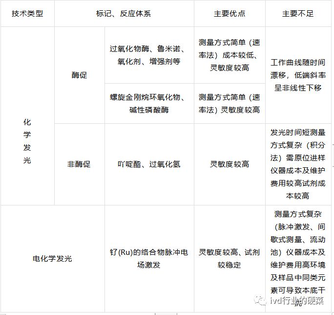 从统计表中看,吖啶酯、碱性磷酸酶标记已经成为了主流,分别有13家和17家厂家采用这两种发光方式,另外苏州翊曼和重庆科斯迈的仪器能够适配两种发光方式。辣根过氧化物酶标记技术仅五家,进口品牌仅奥森多使用辣根酶标记。由于罗氏电化学发光专利过期不久,因此采用电化学发光的目前有深圳普门和北京联众泰克。深圳新产业为ABEI标记,北京科美为均相检测技术。 化学发光按照化学反应类型可分为酶促化学发光和非酶促化学发光两种类型。其中,酶促化学发光主要包括辣根过氧化物酶(HRP)系统和碱性磷酸酶(ALP)系统两类;而非酶促化学发光主要包括吖啶酯系统、ABEI系统。 前两种酶促化学发光系统分别以过氧化物酶、鲁米诺、氧化剂、增强剂;以及螺旋金刚烷环氧化物和碱性磷酸酶为反应体系。其中在碱性磷酸酶反应体系中,螺旋金刚烷环氧化物苯磷酸酯(AMPPD)及其衍生物既可以作为发光剂,又可以作为氧化剂。酶促发光的共同特点为:发光过程中作为标记物的酶基本不被消耗,而反应体系中发光剂充分过量,因此发光信号强而稳定,且发光时间较长。酶作为大分子,在标记小分子抗原时可能会影响分子运动。当然这个可以通过标记新型长臂双功能基团及多种高效间接标记技术来解决。酶促反应的主要缺点是工作曲线可能随时间漂移,而且低端斜率容易非线性下移。 吖啶酯、ABEI等非酶促发光的共同特点:一般采用原位进样和时间积分法测量,即在检测器部位加装进样器,并保证加入发光剂和检测2个过程同步进行;同时以整个发光信号峰的面积为发光强度。灵敏度高。直接发光缺点在于仪器维护费用较高。 电化学发光在原理上与上述发光有所不同,差异点在于氧化反应是通过电极上的电化学反应产生的,而不是由氧化剂或发光剂自身内氧化产生。标记物是三联双吡啶钌及其衍生物,并以三丙胺为还原剂。为降低检测成本并保证测量结果的重复性,目前普遍采用流动池测量方式。灵敏度高,试剂稳定。电化学发光的缺点在于仪器维护费用较高,反复使用的流动池可能导至交叉污染。 均相检测技术最大优点是操作步骤少而简单、测定速度快、结果稳定;但其检测灵敏度和线性范围低于非均相方法,大多数限制于小分子药物和激素的检测。 总之,无论采用哪一种化学发光的原理,核心原料的筛选、抗干扰因素的排除、最大限度消除钩状效应、降低仪器故障率、提升生产工艺、管理水平及技术服务意识等等才是根本之根本。 |