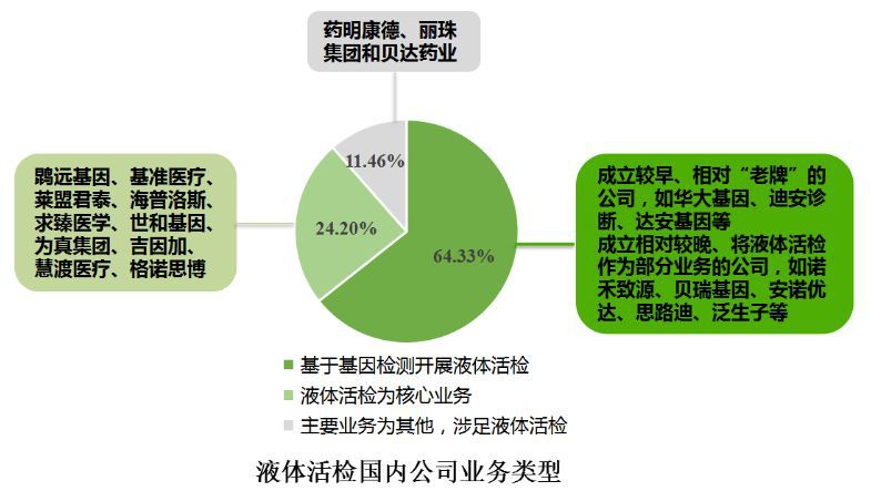 目前,国内涉足液体活检的公司主要有三种类型:(1)基因检测公司(数量为101家,占比为64.33%),这些公司在开展基因检测的基础上纷纷布局液体活检业务,既包括成立较早、相对“老牌”的公司,如华大基因、迪安诊断、达安基因等,也包括成立相对较晚、将液体活检作为部分业务的公司,如诺禾致源、贝瑞基因、安诺优达、思路迪、泛生子等;(2)当前将液体活检作为核心业务的公司(数量为38家,占比为24.20%),如鹍远基因、基准医疗、莱盟君泰、海普洛斯、求臻医学、世和基因、为真集团、吉因加、慧渡医疗、格诺思博等;(3)其他类公司(数量为18家,占比为11.46%),这类公司的主营业务并非是基因检测或液体活检,但是也通过各种形式开展液体活检业务,如药明康德、丽珠集团和贝达药业等。