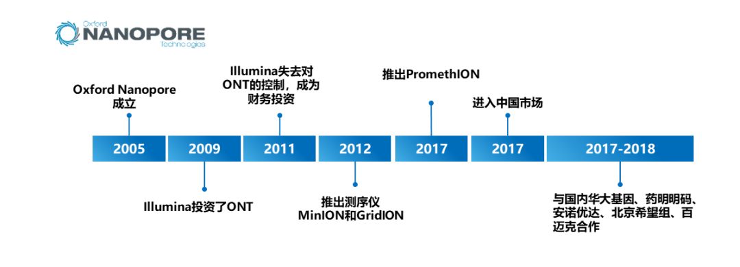 PacBio测序仪的核心技术是单分子实时荧光测序技术,目前主要销售的测序仪为Sequel。2018年PacBio官方再次宣布试剂和软件升级,在读长和通量方面双双提升,使得Sequel在de novo测序、结构变异检测及全长转录组测序等方面的应用更具优势,以满足市场需求。 英国Oxford Nanopore Technologies(ONT)在2005年正式成立,于2015年正式面向市场出售掌上测序仪MinION。其随后推出了可以用于大型基因组和大规模人群测序的台式GridION以及高通量测序仪PromethION。2017年底,ONT的MinION测序仪正式面向中国的消费者发售。目前,已经和国内华大基因、北京希望组、安诺优达等测序企业展开合作。