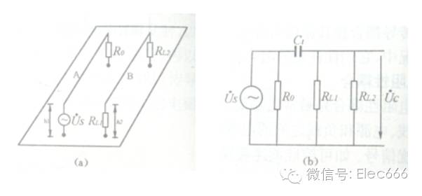 电路A和电路B通过两根导线引起的电容性耦合的情况。又称为电场耦合 。
