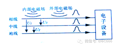 在电源中的干扰分为共模干扰和差模干扰两种,电源线的相线和地线间存在的干扰为共模干扰,如图中的U1;中线和地线间存在的干扰也有共模干扰,如U2;而在线相与中线之间存在的干扰称为差模干扰,如U3。差模干扰电流在相线和中线中大小相等,相位相反。共模干扰在相线和中线中同时存在,大小相等,相位也相同。