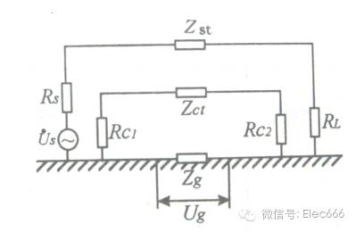 图中Us为干扰源电压,Rs为干扰源内阻,RL为干扰源回路的负载,Zst为干扰源回路的连接线阻抗,Rc1和Rc2是被干扰回路的内阻和负载,Zct是被干扰回路的连线阻抗。Zg为共地阻抗。