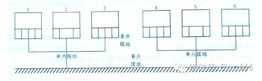 多点接地是指设备中各单元电路直接连接到地线上,有多个接地点,如图所示。对于高频电路,为了降低地线阻抗,一般均采用多点接地方式,图中所用的地线分别连至最近的低阻抗地线上。地线系统一般是与机壳相连的扁粗金属导体或机壳本身,其感抗很小。