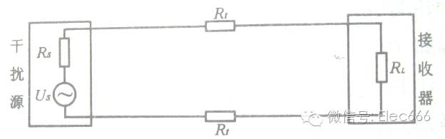 干扰源通过导线的电阻Rt直接耦合到接收器上。设Us为干扰电压,Rs为干扰源内阻,则接收器上的电压为: