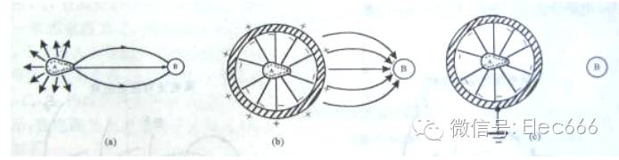 交变电场屏蔽的原理是用接地良好的金属屏蔽体将场源产生的交变电场限制在一定空间内,从而阻断了干扰源到敏感电路之间的电场传播路径。