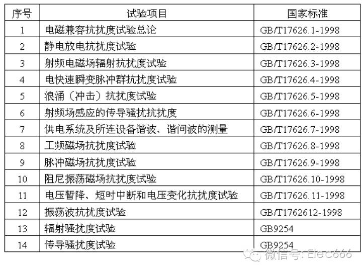有关电磁兼容的国际标准有很多,有美军标MIL/ANSIC/AIR、国际无线电干扰特别委员会(C.I.S.P.R)标准、美联邦标准FED/FCC、德国标准DIN/VDE、加掌大标准C、英国标准BS、ISO、CEN、IEC等,目前在中国通用的国家标准是GB/T 17626、GB9254和GB6833,它们与国际电工委员会标准IEC 61000对应。
