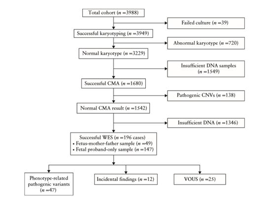 大部分结构畸形的原因并不明确,随着测序技术的发展,全外显子测序已被证明是产后患者寻找病因的强大工具,平均诊断阳性率达到25%左右。这种技术也被逐步地应用到产前,Carss等对30例结构畸形、芯片检测阴性的胎儿进行全外显子测序,10%的患者找到致病原因。贝勒医学院杨亚平教授诊断出来自终止妊娠的11个神经系统异常胎儿中的6个,证明使用WES提高了诊断率。然而这些产前WES研究的样本量都太少,使用WES评估更大的样本量不仅可以提供更准确的诊断率,还可以提供其他信息,例如如何根据表型严重程度对亚组进行分类,这有助于鉴定致病变异。
