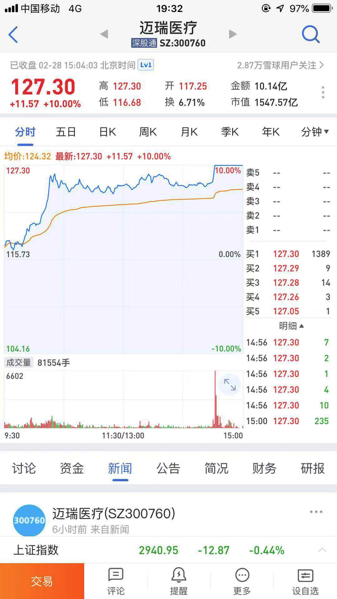 今天(2月28日),迈瑞医疗强势封涨停板,完成一年之内第6次涨停,截止发稿时,迈瑞医疗市值为1547.57亿元,股价更是创历史新高达127.3元/股。