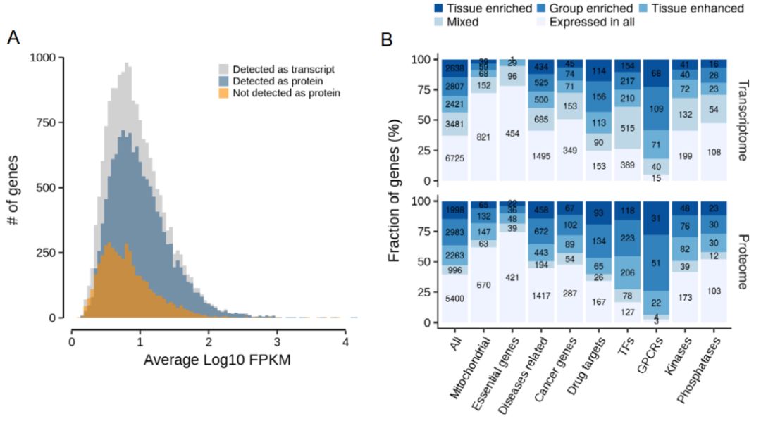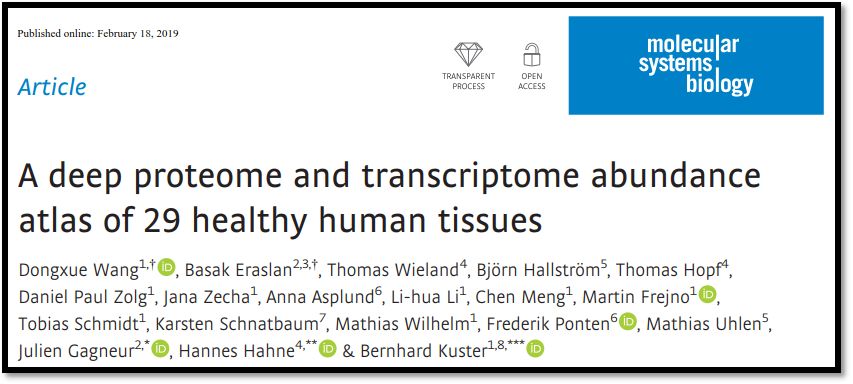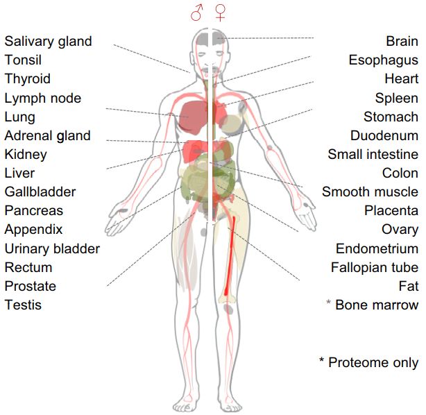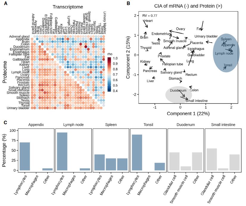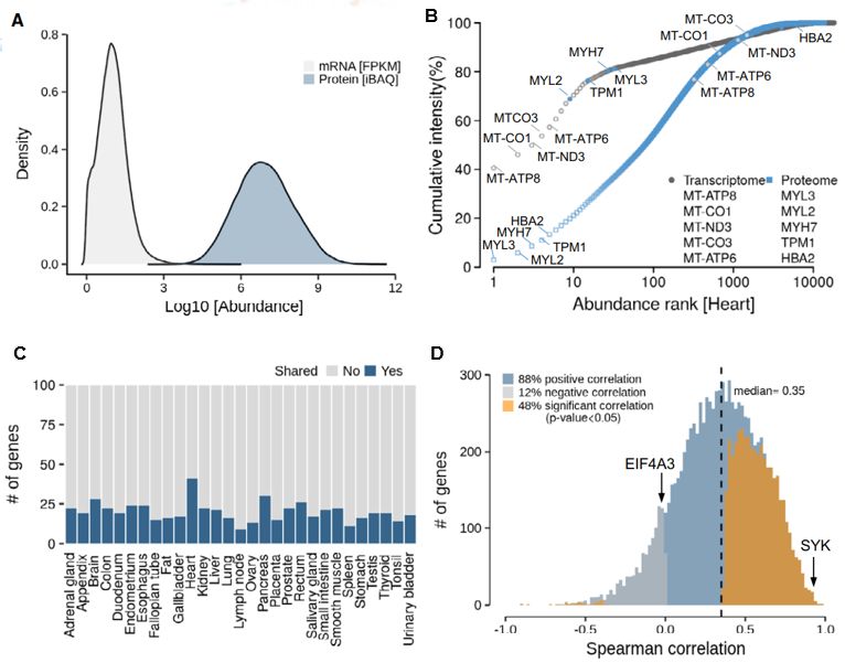 编者按:描述细胞中蛋白质表达和活性的调控因子是生物学中最基本的研究课题之一。随着蛋白质组和转录组分析技术的进步,人们开展了大规模的组学分析。人类蛋白质图谱(Human Protein Atlas,HPA)计划于2003年启动,是由瑞典研究人员发起的大规模蛋白质研究项目,主要目的是绘制人体组织和细胞中表达基因编码的蛋白位置。 人类蛋白质图谱计划,来自HPA官方网站 2017年12月1日,项目发布了第18版的人类蛋白质图谱,图谱由三个子地图集组成,其中:组织图谱包含有关mRNA和蛋白质水平的人类基因表达谱的信息,显示蛋白质在人体所有主要组织和器官中的分布[1];细胞图谱提供对细胞内蛋白质空间分布的高分辨率见解,显示蛋白质在单细胞中的亚细胞定位[2];病理学图谱基于对来自8,000名患者的数据的17种主要癌症类型的分析,显示蛋白质水平对癌症患者生存的影响[3]。 基于人类蛋白质组图谱的研究帮助科学家对人类多种疾病的发病机制进行剖析和研究,然而现阶段组学分析仍主要集中在单个(疾病)组织或单个组织的不同细胞类型上,而健康人体组织的相关研究尚未有报道。另外,目前已经从人类细胞和组织当中获得了广泛的mRNA表达图谱,用来估算蛋白丰度。然而越来越多的证据显示mRNA和蛋白质水平的相关性相当差,这可能与转录后以及翻译后调控有关。 为此,来自德国慕尼黑工业大学等多家合作单位的研究者分析了来自人类蛋白质图谱计划的29种主要的健康人体组织,绘制出人体蛋白质表达的全面基线图。这些数据有助于蛋白质的表达调控以及蛋白组学医学研究与运用。相关研究结果于2019年2月18日发表在国际知名期刊Molecular Systems Biology上。 研究人员对来自人类蛋白图谱计划的29种健康人体组织,进行了定量蛋白质组分析以及转录组测序,产生了18072个转录本和13640个蛋白质的丰度图谱,其中37个蛋白从未报道。生信分析还得到4个有意思的结果:1、某些基因(特别是睾丸中的)尽管有较高的mRNA表达,但却检测不到蛋白质;2、组织特异性表达的蛋白质非常少;3、组织内及组织间的mRNA和蛋白质数量之间存在很大差异;4、组织间蛋白质的表达通常比转录本更稳定。 1. 29种健康人体组织的转录组和蛋白质组综合分析 研究人员首先通过label-free定量蛋白质组学(质谱策略)和RNA-seq分析了29份代表主要人体器官的健康组织标本(样本策略)。RNA-seq一共检测并定量到18072个蛋白编码基因;而质谱一共定量到13640个蛋白,平均覆盖了每个组织表达基因组的86 %。该研究还鉴定到37个从未报道过的蛋白质,而这些蛋白质均通过合成肽得到验证。这些“新”蛋白质的表达水平比中值低约10倍,这可能是它们以前被遗漏的原因。 图1 研究使用的29种健康人体组织图 分析结果显示共有13413个编码基因能够同时在转录水平和蛋白质水平上检测到,检测到的蛋白质几乎跨越了mRNA表达的整个范围(图2A)。然而有意思的是,尽管某些基因的mRNA水平较高,但却无法检测到蛋白质(这些mRNA中约有1 / 3存在于睾丸中,主要参与精子发生过程,而其他组织则无此比例。)。 2. mRNA与蛋白质表达的组织特异性 总的说来,大部分基因在所有组织中表达(转录水平37%、蛋白质水平39%);部分基因在一种或多种组织中显示出高表达(转录水平43%、蛋白质水平53%);还有平均0.73%的转录本和0.65%的蛋白质表现出组织特异性。——两个显著的例外是大脑和睾丸,它们显示出更高百分比的组织特异性。 转录本和蛋白质组织表达分布的上述总体趋势也反映在基因的功能类别中(图2B)。例如,虽然疾病相关基因的表达遵循总体基因的表达分布规律,但通常药物靶点(特别是GPCRs)的表达受到组织的限制——因为只有组织特异性的蛋白质,才能成为更好的药物靶点。因此研究人员指出,人体蛋白质表达基线图对于药物的发现具有普遍价值,例如快速检查感兴趣的特定靶点的表达谱,以便更好地理解药物的不良临床效应和脱靶机制。 此外,研究人员还发现在蛋白质水平上存在一组核心的表达基因/蛋白质,而且各个组织的特征并非mRNAs/蛋白质表达的“有和无”,而是“高和低”。 3. mRNA与蛋白质表达相关性分析 RNA-Seq检测到的转录本的动态范围大约跨越四个数量级,质谱检测到的蛋白质的动态范围跨越八个数量级(图3A)。一般来说,表达的动态范围越宽,采样深度越低。蛋白质水平上更宽的动态范围意味着蛋白质水平除了受mRNA水平影响外,也同时受蛋白质的合成和稳定性的影响。 组织内mRNA和蛋白质表达的巨大差异可以通过对转录本和蛋白质的相对强度排序来观察到(图3B)。令人惊讶的是,在100个表达最高的mRNAs和蛋白质中,只有大约20 %是相同的(图3C)。即使扩大到5000个高丰度的mRNAs和蛋白质,重叠率也只增加到60 %左右。该结果反映了为何mRNA-蛋白质丰度通常只显示出适度的相关性。此外,许多蛋白质在人体组织中以大致相似的水平表达,导至组织间mRNA/蛋白质比率的相关性通常不是很强(图3D)。 研究人员还发现组织间蛋白质组的相关性强于转录组(图4A)。共惯性分析(CIA)结果显示组织内的mRNA和蛋白质水平比组织间的相似性更高(图4B)。此外,CIA还根据生理功能、免疫系统和胃肠道组织的相似性,对组织进行了聚类。有趣的是,这种聚类似乎是由单个组织的细胞组分驱动的。例如,阑尾与脾脏、淋巴结和扁桃体分成一组,这四个组织均含有大量的淋巴细胞;