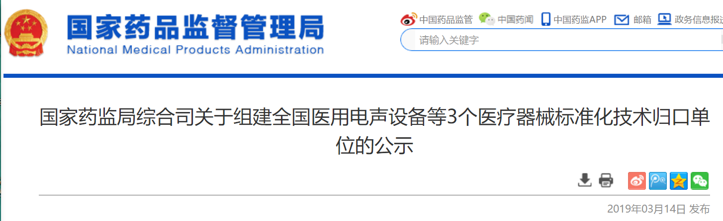 摘要: 为适应医疗器械产业发展需求,结合监管工作实际,经研究,国家药监局拟成立全国医用电声设备等3个医疗器械标准化技术归口单位(组建方案见附件),现予以公示。公示期间,如对医疗器械标准化技术归口单位组建方案有 ...