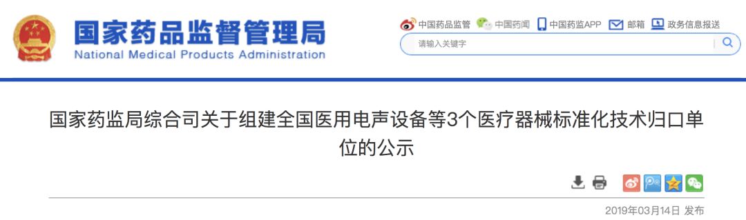 摘要: 为适应医疗器械产业发展需求,结合监管工作实际,经研究,国家药监局拟成立全国医用电声设备等3个医疗器械标准化技术归口单位(组建方案见附件),现予以公示。公示期间,如对医疗器械标准化技术归口单位组建方案有 ...