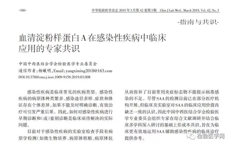 近日,由中国中西医结合学会检验医学专业委员会组织专家在综合文献调研并结合临床多学科深入研讨的基础上形成国内第一部有关SAA的共识——《血清淀粉样蛋白A在感染性疾病中临床应用的专家共识》(以下简称《共识》),发布在《中华检验医学杂志》2019年第3期,旨在为临床更有效地运用SAA辅助感染性疾病的临床诊疗提供参考。 感染性疾病是临床常见的疾病类型。感染性疾病的病原体种类繁多、感染途径多样、症状和体征存在个体差异,如果不能及时明确诊断、有效治疗可引发严重后果。因此,如何对感染性疾病进行早期诊断和(或)鉴别诊断是临床亟待解决的实际问题。 近年来,血清学炎症标志物在感染性疾病诊疗过程中的价值逐步得到临床广泛认可。一些血清学炎症标志物既能在感染早期被检测出,又与疾病的严重程度和动态变化密切相关,有望成为感染性疾病临床诊疗过程中的理想标志物。 目前临床最常用的血清学炎症标志物有C反应蛋白(C-reactive protein,CRP)和降钙素原(procalcitonin,PCT),可较好辅助细菌感染的诊断,但对细菌之外的病毒、真菌、支原体、衣原体等病原体感染的诊断价值尚有待商榷。 血清淀粉样蛋白A(serum amyloid A,SAA)是一种非特异性急性时相反应蛋白,其作为炎症标志物的临床价值近年来得到广泛关注。SAA水平变化对于感染性疾病的早期诊断、危险评估、疗效观察及预后评价都具有重要临床价值。除了在细菌感染中升高外,SAA在病毒感染中亦显著升高,根据其升高的程度或与其他指标联合运用,可以提示细菌性或病毒性感染,从而弥补了目前常用炎症标志物不能提示病毒感染的不足。 《共识》的要点与建议