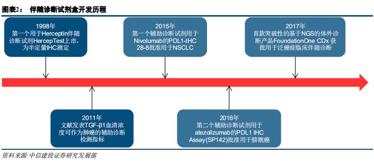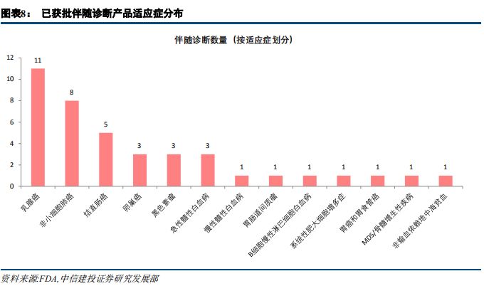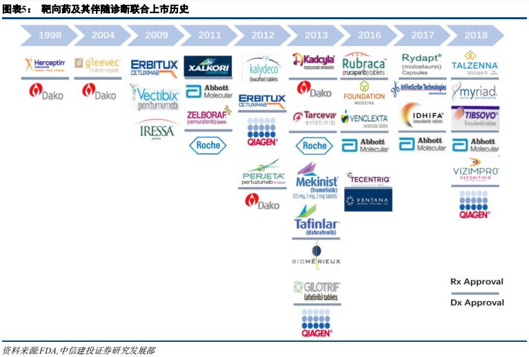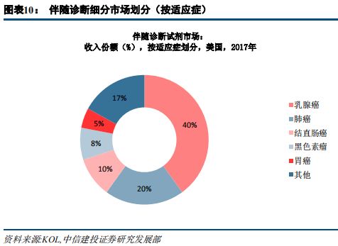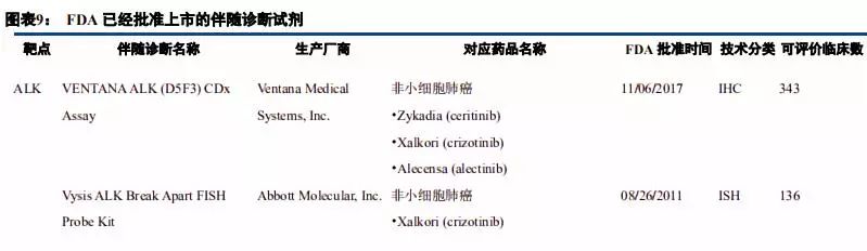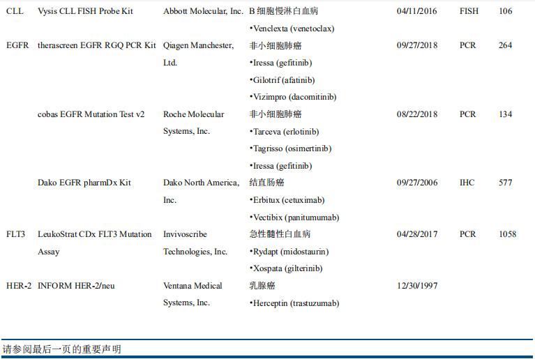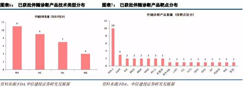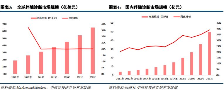 | 摘要 伴随诊断市场处于起步阶段,增长迅速、持续扩容 伴随诊断是一种诊断测试,用作治疗药物的伴随,以确定治疗药物对特定人的适用性,可前瞻性地帮助预测可能的应答或严重毒性。2017年,全球伴随诊断市场规模为26.1亿美元,预计2016年到2022年的年复合增长率将达到22.78%,2017年,国内市场规模约15亿元,预计2020年将达到5.33亿美元,预计2012年到2020年年复合增长率为28%。当前伴随诊断市场处于起步阶段,增长迅速,预计未来随着新肿瘤突变发现、靶向药研发加速及新生物标志物的发现,市场将持续扩容。 治疗理念、监管政策、医保覆盖驱动欧美伴随诊断快速发展 欧美伴随诊断行业发展与治疗理念、审批政策和医保覆盖息息相关。美国引领精准医疗创新,治疗理念、审批政策全面领先,欧洲呈现追随趋势。精准医疗的快速发展、监管和指引的完善、医保覆盖增强,成为欧美伴随诊断快速发展的三大驱动因素。 伴随诊断欧美方法学趋势:PCR仍是主流,NGS后起之秀 从技术类型划分看,PCR仍为主流,占据约30%的市场份额,NGS占据约12%的市场份额。考虑到基于NGS的伴随诊断产品已纳入美国CMS报销范围,后续商保覆盖有望逐步加强,市场份额有望扩大。 共同研发需求决定,伴随诊断厂商与药企深度合作 靶向药和伴随诊断共同研发的需求,决定研发制药公司评估四种不同的获得伴随诊断试剂的方法:伴随诊断试剂的内部开发、与已建立的诊断公司合作、收购诊断公司和前三个方法的混合策略。以及随着合作的深入,伴随诊断+CRO的模式正在兴起。 投资思路 我们认为,伴随诊断投资应从产品和渠道两维度筛选投资标的,推荐艾德生物,关注华大基因、北陆药业。艾德生物拥有领先的测序技术,同时布局液体活检和高通量测序领域,预计2018-2020年EPS分别为0.88元、1.01元、1.42元,同比增长34.6%、15%和40%,当前股价对应2018-2020市盈率分别为55、48和34倍,增持评级。 风险分析 医保控费背景下,伴随诊断定价趋势下行超预期;伴随诊断上游设备及材料供应商涨价超预期;产品研发及商业化进度不达预期。伴随诊断行业概览 伴随诊断:精准医疗伴侣,与靶向药/免疫药相伴相生 伴随诊断(Companion Diagnostics)是一种诊断测试,用作治疗药物的伴随,以确定治疗药物对特定人的适用性。 一般来说,伴随诊断是与药物共同研发的,根据受试者生物学特征,帮助选择或排除患者,使用该特定药物进行治疗试验。伴随诊断基于伴随生物标志物,可前瞻性地帮助预测可能的应答或严重毒性。伴随诊断的说明书一般需要说明与之对应的一个或多个治疗药物,以乳腺癌治疗药物赫赛汀(Herceptin)为例,其伴随诊断生物标志物为HER2,20%-30%乳腺癌患者有HER2过表达,可作为乳腺癌治疗预后因子之一,赫赛汀是HER2单抗,用于治疗HER2过表达患者,总生存期长达25.1个月(vs 20.3个月),因此,经诊断具有HER2过表达的患者使用赫赛汀有更佳疗效,目前美国已有6个Herceptin伴随诊断产品。 从适应症划分,伴随诊断市场可细分为肿瘤、心血管疾病、中枢神经系统、炎症及病毒感染。其中,肿瘤伴随诊断市场最大。从技术层面划分,伴随诊断市场可细分为免疫组化和分子诊断。其中,分子诊断将成为增长最快、市场份额最高,又可以分为PCR、原位杂交和新一代测序。 伴随诊断行业起源于靶向药的诊断需求 目前已开发了多种伴随诊断试剂盒用于各类癌症生物标志物的检测,该细分市场的主要驱动力是靶向性药物研发的增长,需要相应的伴随诊断试剂盒的开发。 全球及国内市场:处于起步阶段,快速增长 据 Markets and Markets 数据,2017年,全球伴随诊断市场规模为26.1亿美元,预计2018-2022年将达到31.3亿、37.6亿、45.1亿、54.2亿、65.1亿美元,2016年到2022年的年复合增长率将达到22.78%,显着高于全球IVD整体行业6%的增长速度。作为体外诊断市场发展最快的细分领域之一,伴随诊断在体外诊断市场的份额逐渐增大,伴随诊断占体外诊断市场占比由2010年的2.9%增长至2021年的14%。 2017年,国内市场规模约15亿元,预计2020年将达到5.33亿美元。2012年到2020年年复合增长率为28%,增速不仅高于全球水平,也显着高于国内IVD行业约15%的增速。 当前伴随诊断市场处于起步阶段,增长迅速,预计未来随着新肿瘤突变发现、靶向药研发加速及新生物标志物的发现,市场将持续扩容。 他山之石:行业发展的三大基石 欧美伴随诊断行业发展与治疗理念、审批政策和医保覆盖息息相关。美国引领精准医疗创新,治疗理念亦最先切换至个体化诊疗,审批政策上采取治疗药物与其伴随诊断同步审评,药审和器审合作审批的形式。欧洲在精准医疗领域呈现追随趋势,但历史原因其药品审评与诊断审评分由两个部门负责,协同性有待整合。从医保覆盖看,2018年美国CMS已确定覆盖NGS伴随诊断,欧洲各国则有差异化政策,其中法国医保覆盖最全面,英国和意大利覆盖较少。 截至2018年12月,FDA批准的伴随诊断产品一共有35个。从靶点分布看,HER2伴随诊断是首个伴随诊断产品,且数量最多,达到10个,其次是EGFR、ALK等常见肺癌伴随诊断,从适应症来看,乳腺癌和非小细胞肺癌是主要适应症,对应伴随诊断数量分别是11个、8个,从技术分类看,PCR和IHC仍是主流技术,近三年NGS产品发展较快,2016年首个NGS伴随诊断产品上市,截至2018年12月,已有4个产品获得FDA批准。 乳腺癌和肺癌是主要适应症,与靶向治疗成熟程度和患者人群高度
