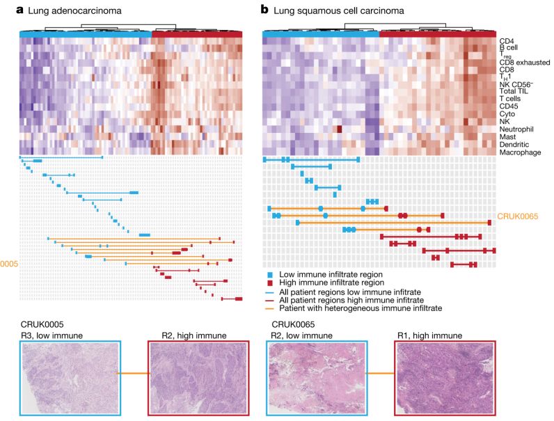 肺癌是世界上最常见的恶性肿瘤之一,其中非小细胞肺癌(NSCLC)约占所有肺癌的80%。近年来,随着我们对肿瘤进展机制认识的增强,NSCLC的治疗研究取得了重大进展。虽然免疫治疗的应用给NSCLC患者带来了前所未有的生存益处,但NSCLC的总体治愈率和生存率仍然较低。因此,深入了解NSCLC的进化与免疫系统的关系,对扩大受益患者人群,改善NSCLC的预后有重要意义。 近日,由英国科学家领导的研究团队报道了“通过治疗追踪非小细胞肺癌进化进程”(TRACERx)计划的最新研究成果。该研究探讨了NSCLC与免疫编辑、免疫细胞浸润、新抗原形成与克隆进化之间的复杂关系。分析结果显示,早期未经治疗NSCLC的单个肿瘤中常常存在多种独立的免疫逃避机制,强调了免疫系统在肿瘤进化中强大的选择压力。相关研究结果已发表在Nature上,文章题为“Neoantigen-directed immune escape in lung cancer evolution”。 TRACERx研究计划是英国癌症研究协会在肺癌研究领域的最大一项单笔投资,致力于揭示肿瘤进化、免疫逃避等机制。该计划将在诊断到疾病治愈、复发整个过程随访肺癌患者,跟踪和分析癌症的发展。本次Nature发表的研究成果就是该研究计划的一部分。 该研究团队利用RNA测序、肿瘤浸润淋巴细胞分析、RRBS甲基化测序以及其他方法,评估了来自88个早期未治疗NSCLC病例258个肿瘤区域的免疫浸润情况与肿瘤进化的复杂关系。同时,他们还以组织病理学为基础考察了83个NSCLC肿瘤样本234个区域的肿瘤浸润淋巴细胞图谱。基于此,研究团队比较了不同肿瘤区域、免疫细胞浸润水平、患者预后以及NSCLC肿瘤组织学所涉及的基因表达、基因突变和甲基化特征。 研究结果表明,超过40%的肿瘤具有持续的低免疫浸润,28%的肿瘤表现出持续的高免疫浸润或因部位而异的免疫浸润。在后一种肿瘤中,免疫浸润的差异似乎与肿瘤突变的异质性一致。 图:NSCLC免疫浸润的异质性。肺腺癌(a)和肺鳞状细胞癌(b)免疫浸润水平聚类。 结合测序信息,该研究发现,随着新抗原基因突变或基因启动子甲基化的转移,不同NSCLC肿瘤以及同一肿瘤不同部位间的免疫浸润存在显著差异。研究人员认为,这种免疫浸润差异可能影响肿瘤免疫编辑以及新抗原在肿瘤中出现的程度。 研究人员经过深入分析发现,在肿瘤进化过程中,免疫浸润低的肿瘤表现为肿瘤抗原编辑功能减弱,表明历史免疫编辑或原克隆性新抗原拷贝会丢失;以广泛免疫浸润为特征的肿瘤区域则表现出持续的免疫编辑,人类白细胞抗原杂合性丧失或新抗原表达减少。该结果强调了肿瘤免疫微环境、肿瘤基因突变和基因调控的改变可能对肿瘤的进化产生影响。 此外,在肺腺癌中,随着CD8+T细胞浸润的增加,亚克隆多样性下降,反之亦然。目前研究结果显示,这种模式在肺鳞状细胞癌病例中不成立。 图:肿瘤免疫浸润能力取决于免疫浸润水平和免疫逃逸机制。肿瘤免疫逃避能力低的患者有较长的无病生存期。 在一系列随访分析中,研究人员发现了新的证据,可以有力支持免疫浸润水平通过改变拷贝数或降低转录表达,来影响肿瘤免疫编辑、克隆进化和新抗原丢失的观点。例如,通过对28例肺癌患者的79个肿瘤样本进行RRBS甲基化分析,研究人员发现非表达新抗原基因的启动子甲基化水平显著上升。总而言之,基于免疫浸润和肿瘤分子特征分析,易发生免疫逃逸的癌症患者由于免疫浸润程度低或其他特征,其无病生存期往往较短。 以上研究结果显示,肿瘤进化是通过免疫编辑机制实现的,这种机制可在DNA和RNA水平影响抗原呈递或新抗原突变。免疫监测的作用以及免疫逃避机制的多样性都应在肿瘤的免疫治疗中加以考虑和利用。 免疫系统具有免疫监视功能,然而,癌细胞在某些情况下能通过多种机制逃避机体的免疫监视和攻击。该研究揭示了NSCLC与免疫编辑、免疫细胞浸润、新抗原形成与克隆进化之间的复杂关系,后续的深入研究,或有助于探讨肿瘤免疫治疗的实施与制定,也为NSCLC以外的其他癌症研究提供了新思路。 参考资料: 1. Neoantigen-directed immune escape in lung cancer evolution 2. TRACERx Study Characterizes Immune Relationship to Lung Tumor Evolution · END · |