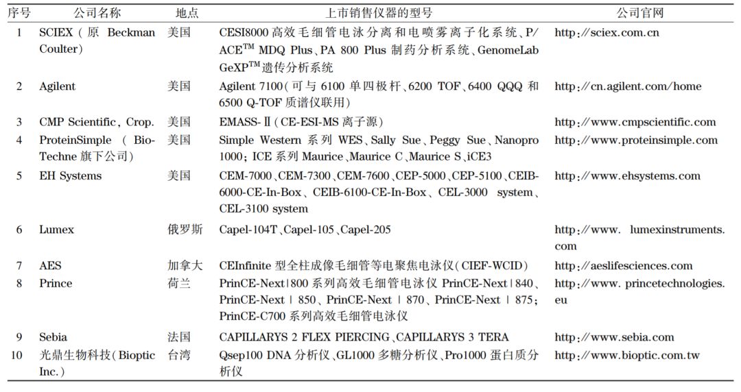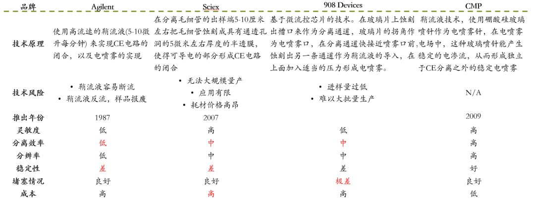 质谱仪全球市场增长良好,国内市场国际巨头垄断 全球质谱市场2015年实现了49.483亿美元的产值,2016-2022年间该市场规模将8.1%的年复合增长率增长。质谱主要的三大应用领域是生物医药、食品和环境,其中制药领域占全球市场最大的份额。 据来源:zion marketresearch 2014年我国医药产业市场规模达到了2.45万亿元,仅次于美国位列世界第二,但是人均用药量还不到美国的七分之一。国内中高端质谱超过40%的需求来自于制药和生物技术相关的领域,这些设备几乎全部需要进口,2016年质谱仪进口金额高达5亿美元。 数据来源:中国海关数据、中国产业信息网 质谱研发难度大,生产工艺要求高,弯道超车需要寻找新的方向 全球质谱市场基本由安捷伦、赛默飞、岛津、沃特世、布鲁克、sciex等巨头垄断。由于应用领域的不同,对于质谱的分辨率、串级能力、分析速度、定性能力和成本的需求不同,各类的质谱应运而生。 主流质谱及厂家(不完全统计) 资料来源:奇迹之光 质谱仪器研发投入大、技术创新难度大。虽然近年国家重大专项对质谱研发大力支持,每年的专利申请也在增加,在2016年国内质谱专利申请达到2125个,但是在专利转化、生产工艺和核心专利上仍然落后,全面掌握质谱相关的精密机械、精密电子、电子离子光学、软件、自动控制等技术的团队较少,具备高性能质谱产业化能力的企业更少。国产质谱仪的发展还需要较长的时间。国内企业如果想弯道超车,需要在新的方向做出探索与尝试。 数据来源:soopat 质谱联用LC-MS发展成熟,CE-MS联用技术瓶颈有突破,市场拓展潜力大 HPLC高效液相色谱已经发展非常成熟,不是一个新领域,无需赘述。毛细管电泳仪自1937年Tiselius发明U型管电泳装置至今已有80年历史,1988年贝克曼公司生产的第一台商用毛细管电泳仪问世(2011年6月30日贝克曼被丹纳赫以68亿美元收购,ABSciex公司也是丹纳赫的子公司,2013年贝克曼毛细管电泳业务转给ABSciex)。 CE与HPLC相比,它的优势在于它只需要较少的样品制备,分离速度快,并且毛细管色谱柱不会像HPLC色谱柱那样堵塞。但是CE在制药行业中并未广泛使用,是因为长期以来和质谱联用的interface技术并没有很好的解决,限制了CE在科研和临床上的应用。虽然高效液相色谱仍然是最广泛使用的分离方法,但毛细管电泳仍具有优于高效液相色谱的优点,随着接口技术的改良,CE-MS分析有较大的市场拓展潜力。 参考资料:PudMed CE上游寡头垄断, CE-MS离子源切入高端分析市场是重要突破口 目前,CE的生产商主要集中在美国,其中国内外市场上最普遍使用的单通道毛细管电泳仪主要是原Beckman和Agilent的产品。Lumex的毛细管电泳仪在俄罗斯及部分欧洲国家占据一定的市场份额。国内市场仍然依赖进口设备。国内的华阳利民、通微分析、凯奥科技、睿科、迈瑞等也陆续推出自主研制的毛细管电泳仪,但是与进口设备的性能仍有差距。 毛细管电泳仪及相关部件生产商 数据来源:Annual review of capillary electrophoresis technology in 2016;Chinese journal of chormatography CE -MS接口技术是实现联用的最关键部分,其中由于ESI自身的优势以及LC-ESI-MS接口技术的成熟,使得ESI离子源的接口在CE-MS联用装置中占据了主导地位。CE-ESI-MS接口主要分为有鞘流液( sheath flow) 和无鞘流( sheathless)两种,两种接口各有优势。 因为易导电、挥发性较强且易电离的鞘流液的加入,鞘流接口装置产生的电泳及电喷雾都较稳定,是最早实现商品化的接口技术。早期安捷伦的技术主要使用的是同轴三通的鞘流接口。但是,鞘流液的加入对样品产生了稀释作用,降低了质谱检测的灵敏度,且鞘流液也容易使出口端的样品发生扩散,影响出峰的峰型及分离效率, 这是目前鞘流接口存在的主要难题。后期的贝克曼和908Devices利用半透膜和微流控管道的技术做了改良,也推出了产品,但是在分离效率和稳定性上都有各自的缺陷,导至应用端并没有太大的发展。 同轴三通鞘流液接口装置示意图 图片来源:Capillary electrophoresiselectrospray ionization-mass spectrometry interfaces : fundamental concepts andtechnical developments. 但近年美国在CE-MS联用的interface方面有了技术突破,导至一些新的应用方向的开发成为可能。圣母大学的Dovichi课题组研究了一种利用电驱动鞘流液的自动化鞘流CE-MS接口装,设计的电驱动的鞘流液装置在不加入分流装置的情况下就可以产生用于辅助喷雾的流量更小且稳定的流体,加电压的方式也更利于自动化调控和使用。授权给美国公司CMP实现商品化,并逐渐应用于药物、蛋白质、多肽、多糖等多类复杂生物样品的分离与检测中,在某些方面表现出比传统LC-MS更加优良的分析性能。 图片来源:Simplified capillary electrophoresis nanospray sheathflow interfaces for high efficiency and sensitive peptide analysis. CE interface生产厂商 数据来源:奇迹之光 质谱前端接口也可作为临床市场的切入点 图片来源:Bing 由于临床应用对于上样的要求比较高,需要做到样本前处理简单,样本处理的一致性高。此外,样本的盐离子对质谱检测会造成影响,因此目标检测物质纯化/分离的效果要求高。对此,国内的一些公司以此为切入口也做了一些有意思的产品。 杭州有公司在做MALDI-TOF前端的上样芯片,利用半导体纳米技术替代传统的质谱靶板,提高产品的稳定性和一致性,有特异性富集的功能,能够显著提高检测的灵敏度。芯片属于一次性耗