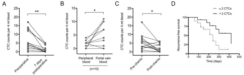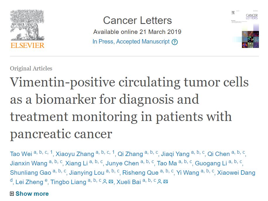 浙江大学医学院附属第一医院肝胆胰外科课题组最新研究结果显示:CSV阳性间质型CTC可以有效辅助胰腺癌化疗和手术疗效监测,同时可作为监测手术后胰腺癌疾病进展及患者预后评估的手段,该研究成果已经发表在Cancer Lett.杂志(影响因子6.491)。 本研究使用杭州华得森生物技术有限公司CytoSorter® 循环肿瘤细胞检测系统,结合基于细胞表面波形蛋白(Cell Surface Vimentin, CSV)的间质型CTC富集检测试剂,高效完成胰腺导管腺癌(PDAC)外周血CTC分选和鉴定。相较于上皮性肿瘤细胞标记物(EpCAM),基于细胞表面波形蛋白(CSV)的PDAC循环肿瘤细胞(CTC)富集检测效率更高。CytoSorter CSV CTC捕获系统对PDAC患者CTC的检出率可达76%(76/100),而CellSearch EpCAM CTC捕获系统在PDAC患者的检出率只有6-30%。 本研究以CTC数量2为阈值,CSV阳性间质型CTC在PDAC、良性胰腺癌(IPMN)及健康人的阳性率分别为65%﹑25%及0%,CSV阳性间质型CTC检测可明显地区分PDAC患者和健康人,这为CTC辅助胰腺癌早期筛查奠定了一定的液体活检基础。 CSV阳性间质型CTC在胰腺癌临床诊断上是个可靠的生物标志物。相对于CSV阳性间质型CTC未检出或只检出1颗的患者,CTC检出超过2颗的PDAC患者通常有较晚期的疾病。相对于局部病灶的PDAC患者,有转移性病灶的PDAC患者CSV阳性间质型CTC更多。16位PDAC患者在手术前后进行了CSV阳性间质型CTC检测,14位患者在术后皆有大幅度的CSV阳性间质型CTC数目降低。15位进行化疗的PDAC患者,有13位疾病好转,肿瘤缩小了,其中12位的CTC数目降低或维持不变;疾病进展的2位患者,其CSV阳性间质型CTC数目显著增加。 CSV阳性间质型CTC计数与可切除肿瘤PDAC患者的肿瘤负担变化相关。对化疗有反应的PDAV患者,在化疗后可观察到CSV阳性间质型CTC计数显著降低。术前有较多CSV阳性间质型CTC的患者有较短的无复发生存期。 另外,本研究还显示CSV阳性间质型CTC检测与CA 19-9检测的联合使用可大幅增加对PDAC患者的诊断效力 (AUC=0.968)。 本研究证实杭州华得森生物CytoSorter® 循环肿瘤细胞检测系统可以用于肿瘤临床诊断,CSV阳性间质型CTC检测对于胰腺癌患者化疗疗效和疾病进展监测,具有一定的临床诊断指导价值。CSV阳性间质型CTC的富集可让临床工作者更深入了解CTC在PDAC上的生物学和临床意义。 参考文献: Wei T, Zhang X, et al. Vimentin-positive circulating tumor cells as a biomarker for diagnosis and treatment monitoringin patients with pancreatic cancer[J]. Cancer Lett. 2019 Mar 21. pii: S0304-3835(19)30165-X. doi: 10.1016 中国CTC 产业联盟,是由国内10 家CTC 研发型企业共同发起,于2016年9月30日正式成立的行业联盟。联盟的宗旨是“促进CTC的学术交流,推动CTC的临床应用,建立CTC的行业标准”,为我国肿瘤患者以及癌症高危人群的慢病防治做出贡献。组成联盟的公司为北京博奥晶典生物技术有限公司、北京中科纳泰生物科技有限公司、杭州华得森生物技术有限公司、益善生物技术股份有限公司、珠海丽珠圣美医疗诊断技术有限公司、上海柏慧康生物科技有限公司、宜昌美光硅谷生命科技股份有限公司、广州安方生物科技有限公司。