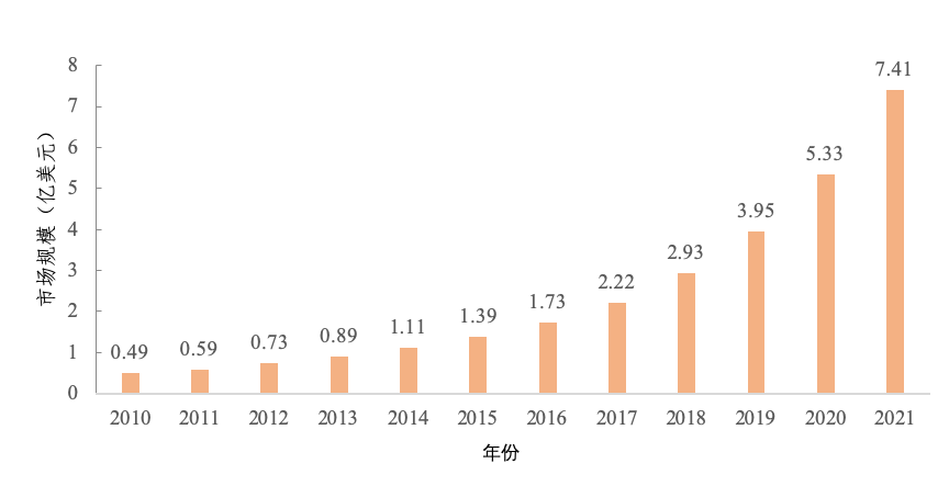 3.1 市场现状 我国还没有完善的伴随诊断定义和相关管理规定,因此以肿瘤相关基因检测和辅助用药诊断代替,2010年市场规模约0.49亿美元,但随着技术、资本、政策和需求的共同推动,预计到2021年,市场规模有望达到7.41亿美元,复合增长率高达28%,远超全球(20.1%)。见图5。