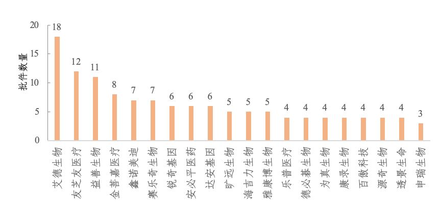 艾德生物、友芝友医疗和益善生物等企业在产品批件上,已取得一定优势。2010年艾德生物“人类EGFR基因突变检测试剂盒(荧光PCR法)”获批,截至2018年末,共有167个产品上市获批。在肿瘤诊断领域进行产品布局的49家中,艾德生物产品最为丰富,共有18种,并已陆续研发了20种单基因或多基因联合检测试剂。见图6。 图6 我国基于基因检测的肿瘤诊断产品批件TOP 20企业