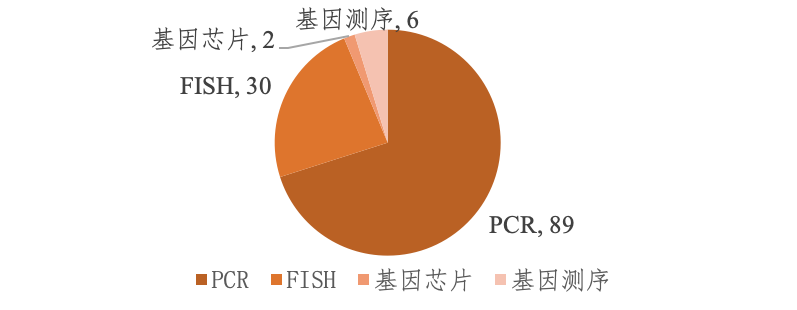 分子诊断肿瘤检测试剂盒产品的使用方法为FISH、PCR、基因芯片和基因测序法4种,其中PCR法最为普遍。见图4。