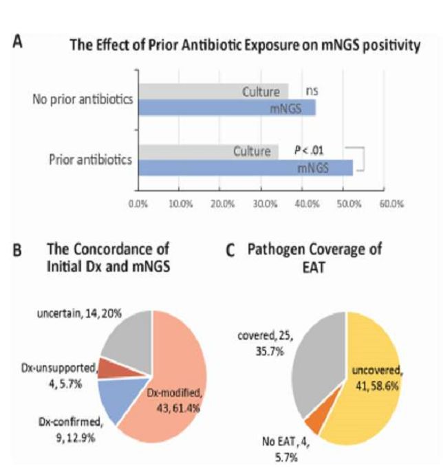 4. 抗生素对mNGS的影响远小于传统细菌培养方法,同时mNGS方法52.7%的敏感性要远高于传统培养方法的34.2%。