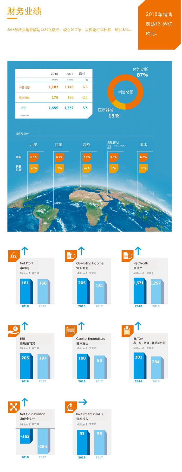 日前,沃芬公司发布 2018 年年报。2018 年度公司合并销售额达 13.59 亿欧元(约合人民币 103.7 亿元,根据 2019 年 5 月 13 日中国银行外汇利率,下同),按固定汇率计算,较之 2017 年增长 5.3%。 在其主要业务领域——体外诊断(IVD),沃芬的表现更为亮眼,销售额的有机增长达 6.5%,三大产品线齐头并进——凝血领域增长 4.7%;急症诊断业务线在完成了最新收购的整合后,增长达 8.3%;自身免疫的增长达 9.2%。沃芬继续加强其在体外诊断领域的领导地位。 沃芬 2018 年度合并净利润达 1.61 亿欧元(约合人民币 12.3 亿元),较之上年小幅增长;EBITDA(未计利息、税项、折旧及摊销前利润)达 3.01 亿欧元(约合人民币 23 亿元),同比增长 6.0%。此外,营业利润达 2.05 亿欧元(约合人民币 15.7 亿元),同比增长 13.2%。 从地域来看,西欧仍是沃芬最大的市场,销售额占比为 42%;北美地区是沃芬最主要且最具竞争力的市场之一,2018 年度增长为 6.5%,贡献了 26% 的销售占比;紧随其后的是亚太地区和拉丁美洲,2018 年度增长均为 6.2%。中国、拉丁美洲和 EEMEAI(东欧、中东、非洲和印度)是预计沃芬未来增长最快的区域。 沃芬 2018 年度财务业绩 以患者为中心,持续投入研发和创新 沃芬一直坚信,当下的研发是保证未来发展的关键因素。2018 年沃芬研发投入达 9300 万欧元(约合人民币 7.1 亿元)。研发人员占公司总人数的 11%。 2016 年,沃芬收购 Tem(床旁患者血液管理的专业公司)。2017 年,沃芬收购 Accriva Diagnostics(专注于手术室和重症监护室床旁凝血检测的领导企业)。 2018 年,沃芬成功完成了对 Tem 和 Accriva Diagnostics 的整合。从而,沃芬急症诊断业务拥有了更广泛的产品组合,能够为急诊、创伤科、手术室以及医院其他领域提供全面的解决方案。 谈及公司未来的规划,总裁 Marc Rubiralta 说:“在沃芬,我们始终以患者为中心,致力于为整个社会创造更大价值。因此,我们坚持研发投入,让创新引领我们走向未来。” 位于巴塞罗那的 Biokit 新技术中心就是最好的范例,技术中心现已完成全面搬迁,正在全力运转中。沃芬其他重要研发和生产中心位于贝德福德(美国马萨诸塞州),圣地亚哥(美国加利福尼亚州),奥兰治堡(美国纽约州),慕尼黑(德国)和巴塞罗那(西班牙)。 Biokit技术中心,位于西班牙巴塞罗那 美国贝德福德研发及生产中心 美国圣地亚哥研发及生产中心 美国奥兰治堡研发及生产中心 德国慕尼黑研发及生产中心 向下滑动显示更多图片 2018 年众多新品问世,未来可期 2018 年,沃芬众多新产品问世,旨在为医务人员提供高质量的诊断信息,并提高医疗系统的效率。 在中国,沃芬推出 ACL TOP 家族 50 系列产品,实现分析前样本质量管理。同时,沃芬在全球范围内推出了具有远程支持预警系统的 ProDx。在美国、部分亚洲和欧洲市场,急症诊断产品线推出新一代血气分析仪 GEM Premier 5000,用于检测患有代谢和/或呼吸系统疾病的重症及慢性患者。此外,VerifyNow 在欧洲发布,用以辅助心血管和神经系统手术。在自身免疫领域,QUANTA-Lyser 3000 系统进一步加强自身免疫诊断自动化进程。美国监管机构(食品和药品管理局)批准 QUANTA Flash HMGCR 标记物用于辅助诊断特发性炎性肌病,以及 QUANTA Flash 钙卫蛋白标记物辅助诊断胃肠疾病,如溃疡性结肠炎和克罗恩病。 所有这些创新都反映在沃芬的发展中。正如沃芬 CEO Carlos Pascual 所说,“近年来,沃芬的发展相当出色,这不单指我们稳健的财务表现。我们拥有 5000 多名德才兼备的员工,我们对创新和价值持续关注,这些都是沃芬发展的基础,让沃芬与众不同。基于这些宝贵的资产,我们对沃芬未来的发展充满希望。” 2019 年,沃芬公司的战略目标包括:进一步加强沃芬在其主要业务领域——凝血、急症诊断和自身免疫的领导者地位;进一步壮大在中国的业务;以及促进拉丁美洲、亚太地区和 EEMEAI(东欧、中东、非洲及印度)等新兴市场的发展。 ACL TOP家族50系列产品,已在中国推出 GEM Premier 5000 VerifyNow QUANTA-Lyser 3000 向下滑动显示更多图片 关于沃芬 沃芬是体外诊断的全球领导者之一,总部位于西班牙巴塞罗那。其在体外诊断领域的主要公司包括 Instrumentation Laboratory(业务领域:凝血、急症诊断),Inova Diagnostics(业务领域:自身免疫),Biokit(业务领域:代工试剂、生物材料,传染病血清学,临床化学和临床软件)。每一天,全球有超过 150 万个标本正在被沃芬的仪器和试剂检测,150 万名患者因此受益。 此外,沃芬通过qixia Leventon 公司(专注于输液治疗)制造医疗设备,并通过 Izasa 向西班牙、葡萄牙及欧盟其他地区进行医疗及科学仪器的分销。 沃芬在 30 多个国家和地区设有分支机构,并通过分销渠道向 100 多个国家和地区提供优质的产品和服务。 供稿:沃芬 |