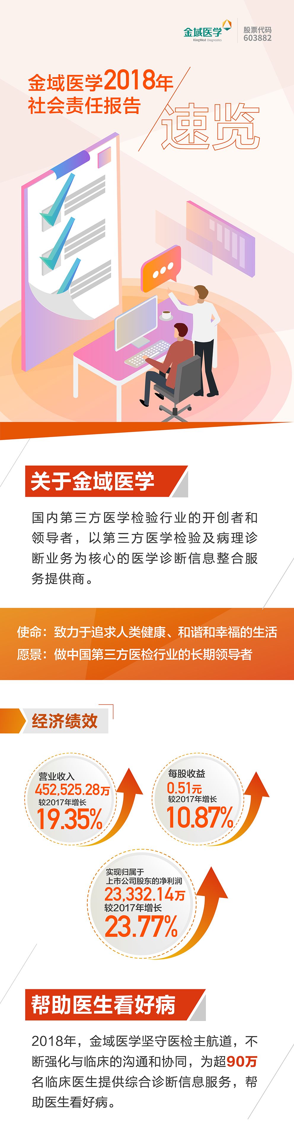 2019年5月31日,金域医学发布2018年度企业社会责任报告。为使命而生,因价值而强。金域医学始终专注在医检主航道上,践行企业的社会责任,为临床赋能、为行业赋能、为社会赋能、为民生健康赋能。
