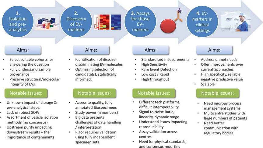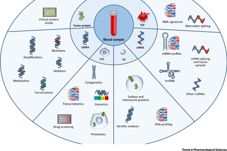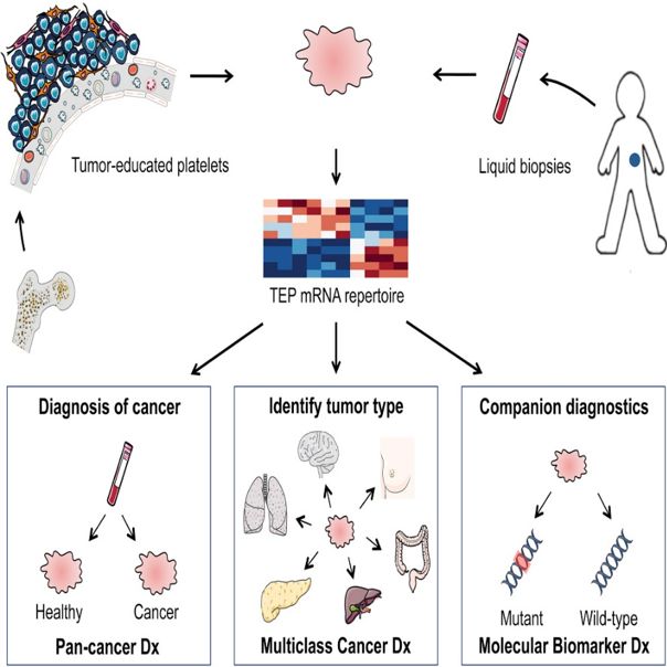 液体活检即循环肿瘤组学,是精确肿瘤学的创新领域,可以克服当前组织活检的局限性。 肿瘤循环组学中,循环肿瘤DNA(ctDNA)和循环肿瘤细胞(CTC)是美国FDA唯一批准用于指导临床应用的。 细胞外囊泡(EV),循环肿瘤RNA(ctRNA)和肿瘤教育/修饰的血小板(TEP)是相对较新的肿瘤组成成分,但在癌症治疗的每个阶段都具有很大潜力。 本文主要讨论肿瘤循环组学各成分的临床应用以及目前限制其在临床应用实施的主要因素。 (续) 细胞外囊泡EV EV是在生理和病理条件下从所有细胞类型中释放的膜状颗粒,是在不同刺激下产生的,如蛋白酶、ADP、凝血酶、炎性细胞因子、生长因子、生物力学剪切和应激诱导物以及凋亡信号等刺激。 EV几乎存在于所有体液中,尤其是血液中。 一度认为EV是细胞消除非必需成分的简单途径。过去十年的发展中,EV被认为是细胞间通讯的基本介质,调节和参与多种生理和病理过程,包括癌症的调节。 基于EV不同的的生物发生、内容物和分泌途径,可将EV分为两大类:外泌体和微泡。 细胞外囊泡作为癌症生物标志物的临床意义 EV携带的分子成分被认为是细胞起源的分子指纹,基于此EV适用于肿瘤生物标记物。与ctDNA和CTC相比,EV在临床癌症诊断中的应用受限,限于EV的分离、分析灵敏度以及稳定性,EV具有较多潜在优势。与CTC相比,EV通常大量生产和释放,在外部脂质膜保护下维持着囊泡成分的稳定性。 与ctDNA和CTC类似,EV可用于定量和定性分析。EV的定量信息可预测恶性疾病和肿瘤负荷的存在。例如,乳腺癌和胰腺癌患者的循环外泌体水平显著增高,多发性骨髓瘤(MM)患者的循环微粒(MP)的数量比健康个体多。此外,循环MP有望应用于晚期NSCLC的诊断和预后。 EV中包含的核酸和蛋白质成分等可提供定性信息。 EV中的编码和非编码(nc)RNA等RNA成分已被广泛研究。 外泌体DNA最近作为生物标志物而受到关注,例如在胰腺癌患者的血清外泌体中检测到KRAS和TP53的突变。 另一项研究中证实,胰腺导管腺癌(PDAC)患者的外泌体KRAS突变比CA 19-9具有更好的预后分层。 EV囊内和膜上都携带有蛋白质,并且已有多篇报道证明EV蛋白可作为癌症生物标志物。 Melo等人证明了循环外泌体磷脂酰肌醇蛋白聚糖-1(GPC1)可区分PDAC与健康人群,准确度高达100%。 最近,Moon等人证明了EV Del-1和纤维连接蛋白可作为早期乳腺癌诊断的生物标志物。 此外,已证实MM中循环CD138 + MP水平增加,并且CD138 + MP在预测患者复发风险和治疗反应方面具有显著预后作用。 最后,annexinV + EpCAM +去唾液酸糖蛋白受体-1(ASGPR1)+循环MP可用于肝细胞癌和胆管癌的诊断,CD147 + EpCAM + MP是CRC的预测因子。 EV分离和分析技术以及最新进展 限制EV作为液体活检应用于临床的最大问题是缺乏样品处理和EV分离分析的标准化流程,这影响临床应用的可重复性。目前EV的分离程序包括许多生物样本处理步骤,并且EV易受到不同类型的物理和化学损伤,可能损害EV和/或改变它们的生物和物理性质。 影响EV研究可重复性的另一个因素是缺乏EV命名和定义的标准化指南,以及验证所需的对照实验。 为了克服这些局限性,国际细胞外囊泡学会最近更新了全面的指南和建议集。 与CTC类似, EV的传统分离方法是利用物理(密度和大小)和生物(表面标记的表达)特性。 EV分离最常用的方法是基于密度的方法,例如差速离心和/或超速离心和密度梯度离心。其中,差异超速离心技术被认为是金标准技术,尤其是用于外泌体纯化。 虽然这些技术使用广泛,但设备昂贵、耗时,且不能保证产物纯度,通常使用中会找到纯度和回收率的折衷点。 过滤和尺寸排阻色谱(SEC)是基于尺寸技术。 过滤可得到高产率和高纯度产物,但受限于EV对过滤器的粘附和高压引起的囊泡损伤。 与超速离心相比,SEC可以更好地回收EV。 免疫亲和捕获方法使用了与EV表面标志物的抗体缀合的磁珠。 该方法的优点是可产生高纯度的EV成分,可基于表面标记物分离出特定的EV子集。 相比之下,这个特征也受限制,可能所选标记物缺少表达而遗漏了潜在重要的EV亚群。免疫亲和捕获与微芯片的整合技术,可进行原位免疫分析[57]。 另一种常用的外泌体分离方法是聚合物沉淀法。 该方法使用聚合物[例如聚乙二醇(PEG)]来降低EV的溶解度,再通过快速低速离心进行沉淀。 该方法产率高,但纯度低。 最近出现了EV电场分离法。Lewis等人开发了一种交流电动(ACE)芯片,能够在30分钟内从全血中捕获外泌体并进行原位免疫荧光分析。作者通过评估GPC-1和CD63的适用性来验证该芯片可用于PDAC的诊断标志物。 最后,有一种基于微流体的新型EV分离方法。该基于不同的EV特性,例如基于纳米尺度的过滤法、具有抗体功能的微流体通道和螺旋惯性微流体装置。Ko等人最新开发了一种磁性纳米孔分选平台,该平台已被用于分离特定癌症来源的EV。他们使用该系统鉴定PDAC小鼠模型的miRNA特征,设计机器学习算法用于不同癌症状态的分类。微流体技术旨在促进实验室芯片系统的开发,以实现快速、经济、集成的EV隔离和分析,用于EV的即时诊断。 EV检测方法也正在发展进步,尤其在蛋白质成分分析方面。常用的分析技术包括WB、ELISA、质谱(MS)和流式细胞仪(FCM)。除FCM外,这些技术主要用于EV批量分析,而不评估个体差异。 FCM目前用于单MP表征分析,但受限于小尺寸而无法分析单个外泌体。 目前外泌体FCM分析涉及多个外泌体与较大珠子