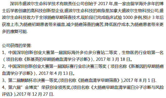 摘要: 深圳市盛波尔生命科学技术有限责任公司创始于2017年,是一家由留学海外多年的博士后学着创建的高新创新型企业,盛波尔生命科技的前身是加拿大盛波尔生物科技公司,盛波尔生命科技致力于全球肠癌早期筛查技术,现阶段 ...