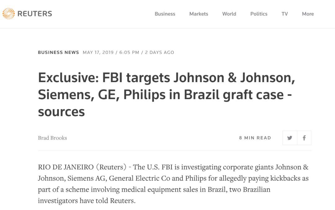 5月17日,两名巴西调查人员对路透社表示,美国联邦调查局(FBI)正在调查企业巨头强生、西门子、通用电气和飞利浦,因它们涉嫌在巴西销售医疗设备时支付回扣。