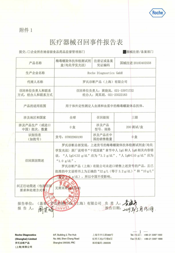 罗氏诊断产品(上海)有限公司报告,由于涉及产品可能存在说明书内容错误问题,生产商Roche Diagnostics GmbH对梅毒螺旋体抗体检测试剂盒(电化学发光法)(注册证编号:国械注进20183402558)主动召回。召回级别为三级。涉及产品的型号、规格及批次等详细信息见《医疗器械召回事件报告表》。