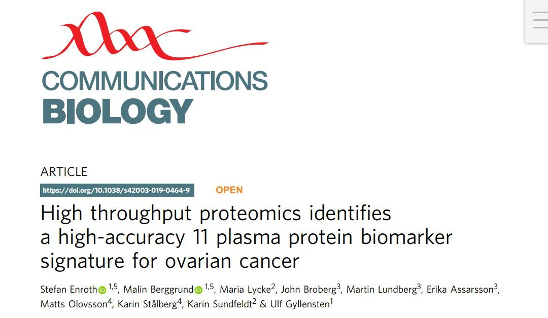卵巢癌作为女性的沉默杀手,其死亡率居妇女恶性肿瘤之首,其发病隐匿、发展迅速、预后差,早期无特异表现,出现症状多已属晚期。70%的患者就诊时已是III期或IV期。尽管有了良好的手术治疗和化疗,但这部分患者的五年生存率还是在20%-40%之间,而I期的卵巢癌患者5年生存率可达90%。因此,迫切需要用于早期检测和改进诊断的其他手段。 近日,来自乌普萨拉大学和哥德堡大学Sahlgrenska学院的科学家表示,他们已经开发了一种血液检测方法,通过高通量蛋白质组学确定了卵巢癌的11种高精确度的血浆蛋白生物标志物,可以为疑似卵巢癌提供更准确的诊断,有望为卵巢癌高危患者提供早期筛查,降低了卵巢癌患者的剖腹探查术的手术率。 相关文章以“High throughput proteomics identifies a high-accuracy 11 plasma protein biomarker signature for ovarian cancer”为题在线发表在《Communication Biology》杂志上。