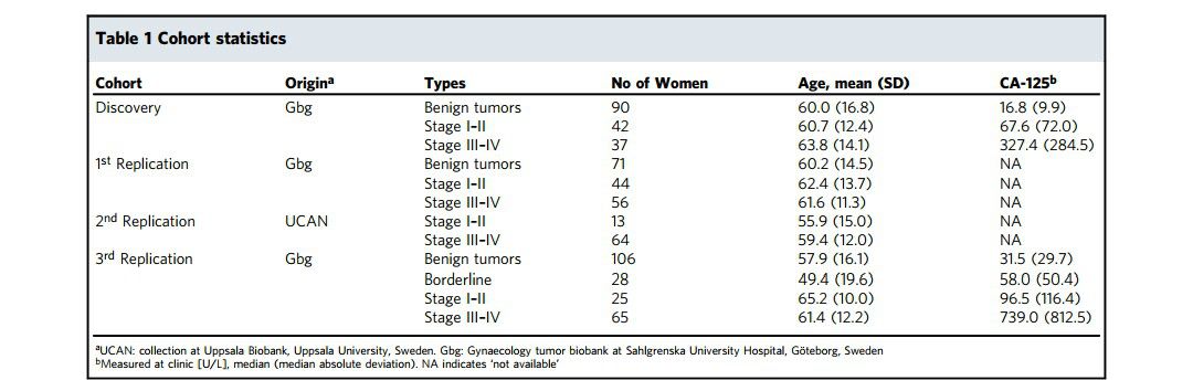 在细胞刚刚发生癌变但尚未形成癌灶之前,就会在体液(不仅包括血液,还有唾液、尿液、胸腹腔积液等)中出现一些游离的“破坏分子”——主要包括:循环肿瘤细胞(CTC)、循环肿瘤DNA(ctDNA)和外泌体等肿瘤来源的生物标志物。液体活检便是通过体外无创抽血的方式获取肿瘤脱落在血液中循环的ctDNA、CTC、外泌体等,以此来判断肿瘤的基因突变情况。相比传统肿瘤组织活检,液体活检具有许多优势,包括无创,可以多次取样,可同时检测多个肿瘤等等。 液体活检给正在探索的研究人员提供了灵感,为了寻找新的生物标志物,他们使用邻近延伸试验(PEA)比较了三组患有卵巢癌和良性肿瘤的患者中593种蛋白质的循环血浆水平,并开发了组合策略用于鉴定不同的多变量生物标志物特征。 593种蛋白质的队列统计