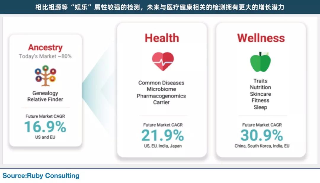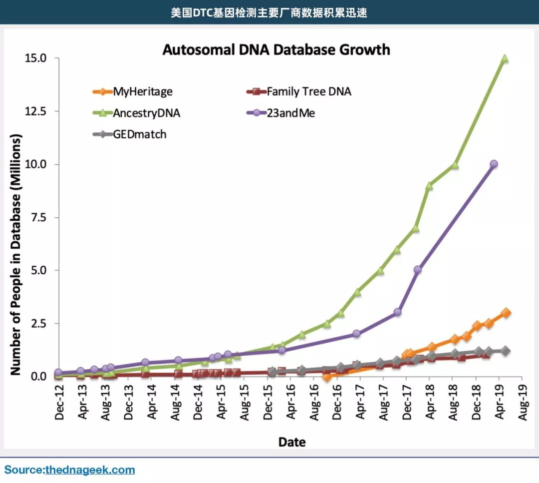 DTC(direct to consumer)基因检测, 是国内基因检测行业近年来较为热门的细分领域之一。其商业模式为通过线上或线下渠道,直接向消费者出售检测套装,回收样本,进行检测并出具个人基因的检测报告;其特点包括: 1.高度互联网化:目前国内外主流的DTC基因检测品牌均主要依靠电商或官网进行销售(这一点也和监管政策有关); 2.检测项目“轻”健康化,面向消费者,以及立足互联网这两个特点,促使DTC检测产品经常以“祖源、饮食、运动”等非疾病相关的项目作为主要卖点; 3.增长迅速:作为全球最大的消费基因检测市场,美国的消费基因检测在过去年的两年中呈现出爆发式的增长,总的数据量迅速从2017年中的约500万上升到2019年中的近3,000万人,已经有近10%的美国消费者使用了消费基因检测。 而在国内,DTC基因检测行业自2015年由WeGene、23魔方等企业拉开帷幕至今,也经历了持续的高速增长。但对于这一新兴行业,国内资本市场的观点却褒贬不一:有人认为DTC基因检测是快速获取大量人群基因数据的有效途径,并且与大健康产业的诸多环节存在良好的协同效应。也有人认为DTC基因检测缺乏严肃的临床价值,是“科学算命”的一种,同时基因组数据的价值还有待开发,因此这个行业的前景还有待商榷。 浩悦资本通过案头研究、对基因检测业内人士、投资人、生物信息行业以及制药行业相关专家的走访,总结出了全球DTC行业近年来的六个主要变化趋势,希望能帮助大家理清这一新兴行业的脉络。 ” 趋势1-业务来源:从纯C端服务往C端和B端(医院、药企)结合发展 DTC模式和基因队列,是获取和积累基因数据的两大途径。基因队列的定义,是将某一特定人群按是否暴露于某可疑因素或暴露程度分为不同的亚组,追踪观察两组或多组成员结局(如疾病)发生的情况,比较各组之间结局发生率的差异,从而判定这些因素与该结局之间有无因果关联及关联程度的一种观察性研究方法。 进入21世纪后,随着基因组学技术的飞速发展,基因组数据研究被越来越多的队列研究采用,作为作为疾病风险因素、人群细分等分析的重要依据。最典型的就是英国的UK Biobank,中国的慢性病前瞻队列等。23andme等DTC基因检测公司在基于DTC基因检测的商业模式积累的大量的用户和基因组数据后,也积极地对用户进行随访,形成了规模巨大的以基因组数据为核心的人群队列,并与药厂一起挖掘其中所蕴含的药物研发价值。 以23andMe和Helix为代表的DTC企业,也在逐渐向基因组队列领域拓展业务;与此同时,GSK、赛诺菲、武田、新基等头部药厂也联合发起了基因组大队列数据库Open Target,目的在于寻找新的药物靶点与新药开发;除此之外,以冰岛政府和凯撒保险为带包的政府与保险公司,也开始了基因组队列的布局,期望能对国家族群的基因特性加以研究,或进行保险用户的早期干预和精准控费。 另一方面,直接面向终端消费者的产品推广可以获得高粘性的用户,树立起强大的终端品牌影响力。但也存在获客成本高企,获客效率低的问题。随着消费基因检测头部公司的品牌影响力的提升,消费基因检测公司开始以联合品牌、解决方案提供商等方式通过药企、医疗健康连锁机构、保险公司等更加高效的渠道合作拓展用户。 全球DTC行业的代表性企业23andMe,从2014年就随着数据积累量的上升,开始与药企等支付方合作,寻求基因数据变现的途径,以及基于数据积累自主开发药物的可能性。先后与Genetech、GSK等知名药企开展了相关合作,并与罗氏、辉瑞等药企开展了临床试验合作。 趋势2-检测技术:从基因芯片往全基因组测序发展 现在中美主要的DTC基因检测公司以Illumina或Affymetrix基因芯片为主要检测平台。国内外主要的群体基因组学队列研究,例如国内50万人的中国慢性病前瞻队列(CKB)和英国50万人的UK Biobank项目也都是采用的基因芯片。基因芯片主要用于检测基因组上常见的60万-80万个多态位点,设计合理的基因芯片加上imputation算法对于目标人群常见突变有很好的检出能力。但对于罕见突变、结构突变、拷贝数等更加复杂也日益重要的突变而言,基因芯片无能为力,这限制基因芯片所检测的数据在更加深入的基因组学研究、临床基因检测等领域的应用。 美国近两年的新成立个人基因组公司,例如Veritas Genetic(奕真生物)、Illumina孵化的Helix等都采用了新一代测序技术,尤其是全基因组测序技术。哈尔滨工业大学的中国十万人全基因组测序项目、美国100万人的AllofUS项目以及英国UK Biobank后续的Genomics England项目等都采用了全基因组测序技术。 因此无论是在DTC基因检测还是群体基因组学,乃至临床应用上,都存在基因芯片技术逐步升级到测序技术,尤其是全基因组测序技术的发展趋势。随着华大智造和Illumina在新一代高通量测序仪领域的竞争日益激烈,这个升级换代的过程会被加速。 这种技术升级对相关的公司在供应链、实验技术和管理、数据分析和管理、解读和应用等环节上都提出了更高的要求。 趋势3-分析技术:从传统算法往人工智能发展 随着基因组数据规模的迅速增加和所需要分析解读的突变类型日益复杂,表型和医疗数据也不断丰富,对数据分析算法提出了更高的要求。传统的基于遗传学家经验和知识构建起来的启发式算法已经遇到了发展瓶颈,以深度学习为代表的机器学习技术正逐步成为基因组数据分析,尤其是基因