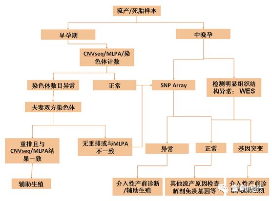 流产组织检查后的经典问题: Q1:流产物绒毛CNV异常:重复、缺失等非整倍体,怎么办? A:(1)根据片段大小,检索致病情况,了解后果 (2)来源验证,是新发还是遗传,评估再发风险。 (3)生活工作环境,饮食,药物等接触情况。 (4)夫妻双方年龄,生殖功能评估,科学备孕或者辅助生殖。 (5)生活方式等改变建议。环境、饮食运动生活方式等。 Q2:胎儿畸形、水肿、四肢短小、骨骼发育异常、肢体异常或者心脏异常等,怎么办? A:(1)家系情况分析,根据胎儿异常表型,初步确认异常情况或者疾病 (2)夫妻表型详细评估,智力、教育背景或学习能力等。 (3)基因检测策略:snparray,panel,WES (4)表型分析,基因检测结果阴性或者阳性时的再分析、表型核对。 (5)夫妻再生育时的优生指导,科学备孕或者辅助生殖。 Q3:胎儿存在染色体异常,父母有染色体易位携带,怎么办? A:(1)父母有染色体携带也有可能生出正常小孩 (2)夫妻异常情况分析 (3)非同源染色体间平衡易位1/18形成正常配子,1/18表型正常的平衡易位携带者,其余均不正常,会出现胎儿流产或者胎儿畸形。 (4)罗伯逊平衡易位1/6形成正常配子,1/6表型正常的平衡易位携带者,其余均不正常,会出现胎儿流产或者胎儿畸形。 (5)结合具体情况具体分析,选择合适的生育方案。