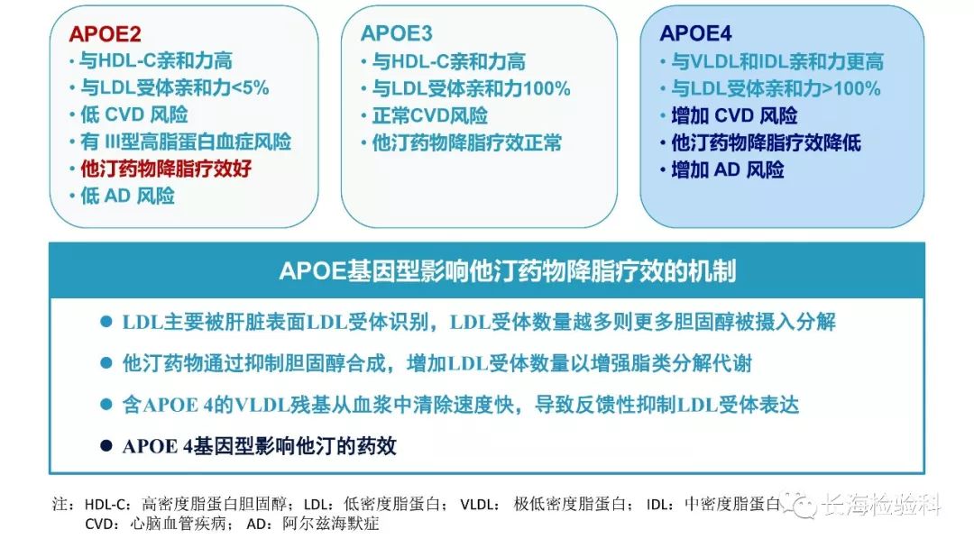 APOE在他汀类药物代谢中的作用 APOE也存在多态性,可以形成三种单倍体:APOE2、APOE3、APOE4。 研究发现,他汀类药物对APOE4携带者的疗效往往不佳或无效,而对APOE2携带者的降脂效果最强。 SLCO1B1和APOE的基因分型及临床检测意义 根据基因检测结果,制定个体化治疗方案 他汀类药物代谢基因检测适应人群: 1、初次服用他汀类药物的患者; 2、服用他汀类药物后出现药物不良反应的患者; 3、多次服用他汀类药物后,降脂效果不达标的患者。 参考资料: 1. Circ Cardiovasc Genet.2009 Apr;2(2):173-81 2.中国成人血脂异常防治指南(2016年修订版) 3. 中国阿尔兹海默症检验诊断报告模式专家共识(2016版) |