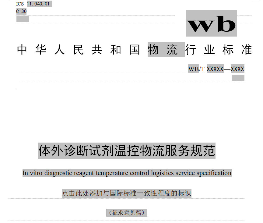 各有关单位及专家: 由中国物流与采购联合会提出、全国物流标准化技术委员会归口的《体外诊断试剂温控物流服务规范》行业标准经起草单位调研、起草、研讨和修改完善后,现已形成征求意见稿。 按照《行业标准管理办法》有关规定,向社会公开征求意见,请各位专家及相关人员填写《意见反馈表》,并于9月10日前将《意见反馈表》发送至秘书处或起草单位,逾期未回复视为无异议。 一、联系单位:中国物流与采购联合会医药物流分会 联系人:王晓晓,刘洋 电 话:15911188972,18401600052 传 真:010-68189989 地 址:北京市丰台区双营路9号亿达丽泽中心326室 邮 编:100073 二、全国物流标准化技术委员会 联系人:李静琳 电话:010-83775627 联系地址:北京市丰台区菜户营南路139号亿达丽泽中心1号楼311 邮编:100073 附件: 《体外诊断试剂温控物流服务规范》行业标准征求意见稿 前言 Ⅱ 12 人员与培训 5 16 物流作业温度异常管理 6 前 言 本标准按照GB/T 1.1-2009给出的规则起草。 本标准由中国物流与采购联合会提出。 本标准由全国物流标准化技术委员会(SAC/TC 269)归口。 本标准起草单位:中国物流与采购联合会医药物流分会、北京中物冷联企业管理有限公司、北京医链互通供应链管理有限公司、深圳迈瑞生物医疗电子股份有限公司、罗氏诊断产品(上海)有限公司、解放军总医院、北京市医疗器械检验所、上海医药物流中心有限公司、广州医药有限公司、瑞康医药股份有限公司、陕西医药控股集团派昂医疗器械有限公司、北京人福医疗器械有限公司、天津信鸿医疗科技股份有限公司、四川高芯数康生物医药有限公司、四川省亚中冷链医药物流有限责任公司、顺丰速运有限公司、北京盛世华人供应链管理有限公司、中集冷云(北京)供应链管理有限公司、武汉市美乐维低温物流有限公司、福建栢合冷链仓储管理有限公司、江苏省精创电气股份有限公司、江苏华越医疗器械投资有限公司、杭州鲁尔新材料科技有限公司、杭州医智捷供应链管理有限公司、江苏哲勤科技有限公司、多美达(深圳)贸易有限公司、武汉阿米特科技有限公司。 本标准主要起草人:
