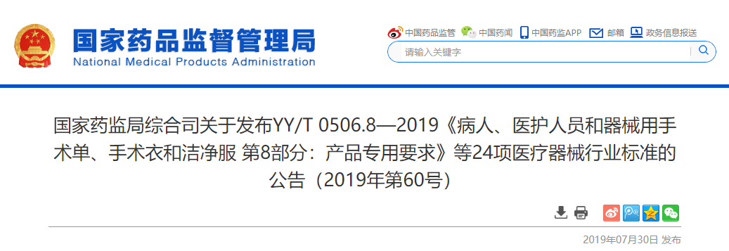 YY/T 0506.8—2019《病人、医护人员和器械用手术单、手术衣和洁净服 第8部分:产品专用要求》等24项医疗器械行业标准已经审定通过,现予公布。标准编号、名称、适用范围和实施日期等内容见附件。