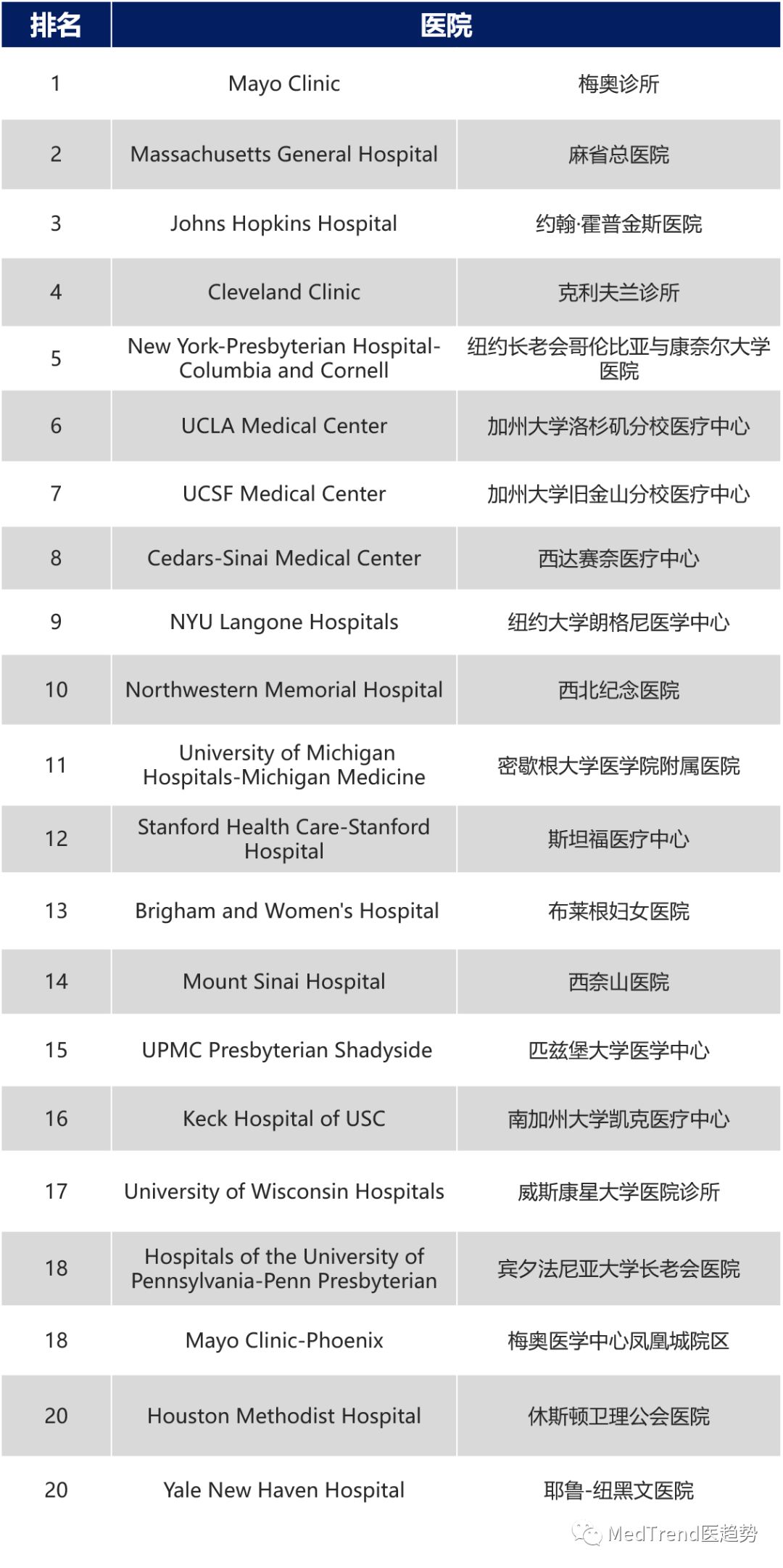 《美国新闻与世界报道》是一本与《时代》和《新闻周刊》齐名的新闻杂志,最近,该杂志重磅发布了《2019-20家美国最佳医院》榜单。 榜单分析了近5000家医疗中心的数据,并调查了3万多名医生对于16个专科(包括癌症、糖尿病、风湿病)等的反馈。存活率、患者安全、专业人员和医院声誉都是衡量因素。 综合排名上,梅奥诊所继续排名第一,一枝独秀。 与2018年排名相比,麻省总医院排名上升至第二位;克利夫兰诊所下滑至第四位,梅奥诊所、约翰·霍普斯金排名保持不变。 除了医院在美国的综合实力排行 还分别对美国16个专科进行了评价 看什么病?哪个医院哪个科室强? 接下来给你解答! *治疗癌症,包括乳腺癌、皮肤癌和胰腺癌。 *治疗心血管疾病、心脏移植和其他复杂心脏疾病。 *治疗糖尿病、甲状腺功能减退症、垂体疾病以及其他内分泌系统疾病。 *治疗耳鼻喉科疾病,如影响耳、鼻、喉、头、颈和平衡的疾病。 *治疗功能性和结构性肠和结肠疾病。 *分析如何照顾超过75岁的老年人,涵盖一系列的医疗条件。 *擅长治疗妇科疾病,如子宫切除和其他生殖系统手术。 *治疗肾脏疾病,包括肾脏移植。 *治疗神经问题,如阿尔茨海默症和痴呆,以及帕金森病,多发性硬化症和癫痫。 *治疗眼科疾病。 *骨科手术,其他肌肉骨骼损伤问题。 *进行心理状况的研究和治疗。 *治疗晚期肺癌、肺纤维化和肺气肿等肺部相关疾病以及肺移植手术。 *促进患者从创伤、中风、心脏病发作和其他情况的康复。 *治疗肌肉骨骼疾病和自身免疫性疾病,如骨关节炎、狼疮和类风湿关节炎。 *治疗泌尿系统疾病以及影响膀胱和前列腺的疾病。 · END · |