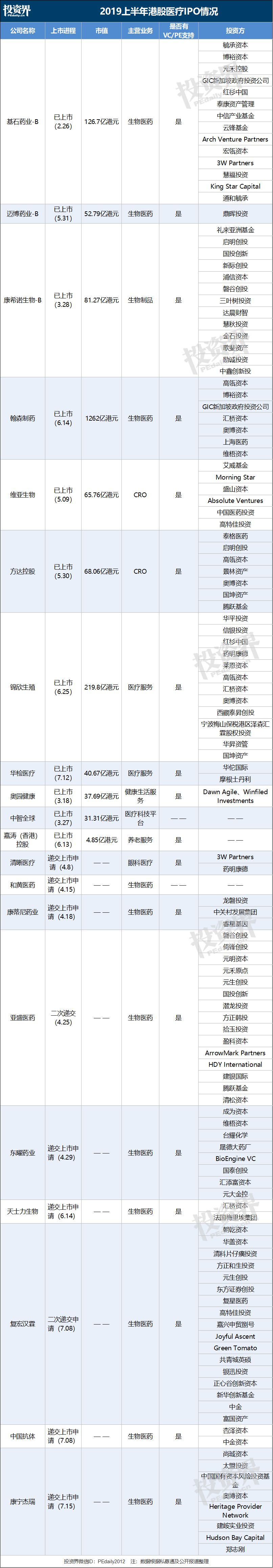 作者 I 任倩 谭咪娜 报道 I 投资界PEdaily 资金收窄、热度降温、保守、理性、两极分化……这些在投资界采访时出现的高频词汇,也在预示着:医疗投资的拐点已经出现。 “募资冰冷、内心躁动,表现得却也热闹非凡。”对于2019上半年的医疗投资景象,一位知名PE投资人给出这样的评价。 投资界不完全统计,2019 上半年(H1)医疗健康行业融资事件272起,融资总额近300亿元,对比2018上半年412起事件和654亿元的融资额,几近腰斩。 虚火正逐渐褪去,但不可否认的是,医疗健康仍是今年VC/PE重金押注的赛道之一。据不完全统计,2019H1参与投资这一行业的VC/PE超500余家,IDG资本、红杉中国、元生创投、国中创投、华盖资本、君联资本、礼来亚洲基金、高特佳、幂方资本、夏尔巴投资、中金资本等最为活跃。 而退出方面,2019H1仅在港交所递交上市申请的医疗行业企业就有20家。投资界统计发现,这20家企业中仅2家背后没有VC/PE支持,其余18家投资方数量众多,其中不乏高瓴资本、红杉中国、博裕资本、启明创投、华平投资、鼎晖投资等头部机构,VC/PE数量超100家。 钱都去哪儿了? 超500家VC/PE投资医疗近300亿 2018年以来,VC/PE募资难的困境持续传导到项目端。总体来看,2019H1融资情况并不乐观,但医疗健康领域仍然位列“吸金”Top3。尤其在今年5月,大量资金涌入生物技术/医疗健康行业,涉及投资金额123.52亿元人民币,排在所有行业之首。 投资界不完全统计,2019上半年,国内医疗健康行业发生272起融资事件,背后涉及VC/PE超500家,融资总额近300亿元,主要集中在创新药、生物技术、医疗器械、医疗信息化、医疗服务、医药零售以及健康管理等细分领域。 具体来看,创新药仍然是吸金“重头戏”,也是资本长线关注重点。此外,以再生医学、基因检测、基因治疗、细胞治疗为代表的生物技术成为最大热门。投资界梳理发现,近140亿元投向生物技术与医药领域,几乎占融资总额的1/2。 医疗服务依然受到青睐,吸纳约70亿元融资,齿科、眼科、医美、中医连锁、辅助生殖、康复、疼痛、日间手术中心等都是投资热点。 医疗器械涉及多学科领域交叉,具备“科技+医疗”的独特属性,也是目前资本持续看好的领域之一,融资超20亿元。医疗器械目前的热门赛道主要集中在IVD、高值医疗耗材、医学影像、机器人等。除此之外,AI、大数据、云计算等医疗信息化公司也是资本追逐的焦点,融资近20亿元。 从轮次来看,2018年上半年,医疗健康行业融资仍以早期项目为主,种子及天使轮、A轮融资占比达58%。但天使轮项目明显减少,大额融资增加。可以看到,行业趋于成熟,投资向头部玩家集中,战略投资的频次逐渐提高。 比如生物技术和制药领域,2019上半年发生不少大额融资事件,艾力斯医药11.8亿元、海和生物唯一一轮融资1.47亿美元、乐普生物9亿元、燃石医学8.5亿元。医疗服务领域里,也诞生两笔巨额融资——阿里健康22.7亿港元、企鹅杏仁2.5亿美元。 值得一提的是,国内医疗企业单笔融资额创下新高,京东健康获超10亿美元注资。2019年5月9日,京东与CPEChina Fund、中金资本和霸菱亚洲等投资者就京东健康的A轮优先股融资达成最终协议,融资完成后,京东仍是京东健康的控股股东。 而从VC/PE医疗投资的频率看,2019上半年医疗健康产业参与投资的投资机构超500家,IDG资本共参与7起融资,出手最多。其次元生创投6起,国中创投、华盖资本、君联资本、礼来亚洲基金、幂方资本、夏尔巴投资、中金资本参与5起投资,红杉中国、道彤投资、高特佳参与4起,此外,松禾资本、基石基本、深创投等也相对活跃。同心医疗、思多科、妙手医生,仅半年就获得两轮投资。 超100家VC/PE潜伏 高瓴收获10家医疗IPO,数量最多 自从2018年港交所新政以来,医疗企业IPO“行动”就备受瞩目。如今科创板一开,无疑开辟了一个新的退出通道,上市争夺战早已打响。 据投资界不完全统计,2019年上半年仅在港交所递交上市申请的医疗行业企业就有20家,涉及生物制药、CRO、辅助生殖服务、养老服务等领域,有14家来自生物医药这一细分赛道。截止目前,已有11家企业已完成IPO,平均每月2家IPO。 生物医药企业一向是资本市场的“香饽饽”,成功上市的企业数量最多。 2018年,已有包括歌礼制药、百济神州、信达生物、华领医药、君实生物等多家挂牌上市。2019年,基石药业、康希诺生物、迈博药业、翰森制药4家公司率先IPO。 另外,还有十余家药企已在港交所提交上市申请排队中,其中包括复宏汉霖、亚盛医药、东曜药业、和黄中国医药、天士力生物、康蒂尼药业、中国抗体制药以及康宁杰瑞等。 投资界统计发现,这20家企业中,仅2家背后没有VC/PE支持,其余18家投资方数量众多且相对分散,其中不乏高瓴资本、红杉中国、博裕资本、启明创投、华平投资、鼎晖投资等头部机构,VC/PE数量超100家。 2019上半年,高瓴资本在医疗领域迎来集中爆发。1月至今,除基石药业、翰森制药、方达控股、锦欣生殖在港股上市外,BridgeBio Pharma、Akero、NextCure、Zoom、Covetrus、Gossamer Bio在海外上市,收获10家IPO企业。 红杉中国分别收获基石药业、锦欣生殖2家医疗上市公司,启明创投亦收获康希诺生物和方达控股2家,博裕资本同样收获基石药业和翰森制药2家,而鼎晖投资成为迈博药业唯一外部投资方。此外,元禾原点、元生创投等机构也布局2家医疗企业,皆已在港交所IPO或已递交