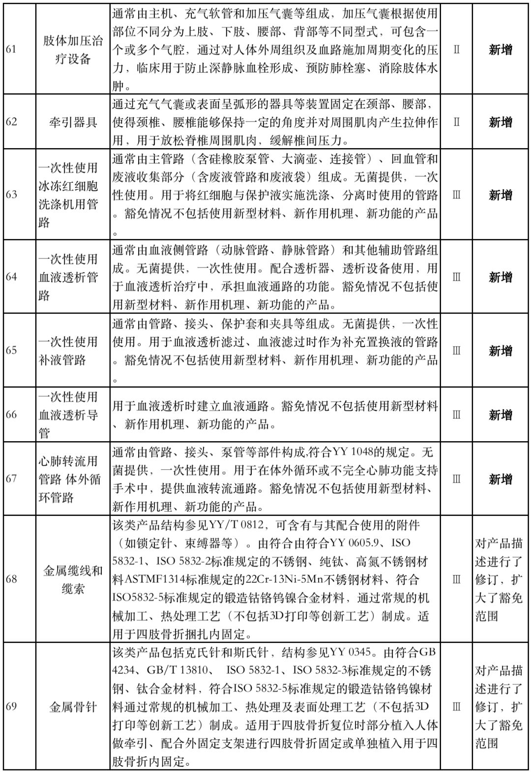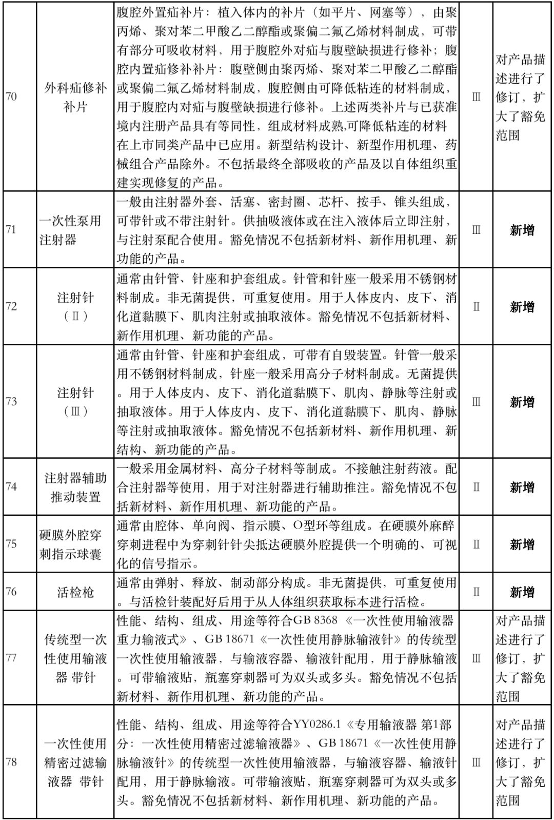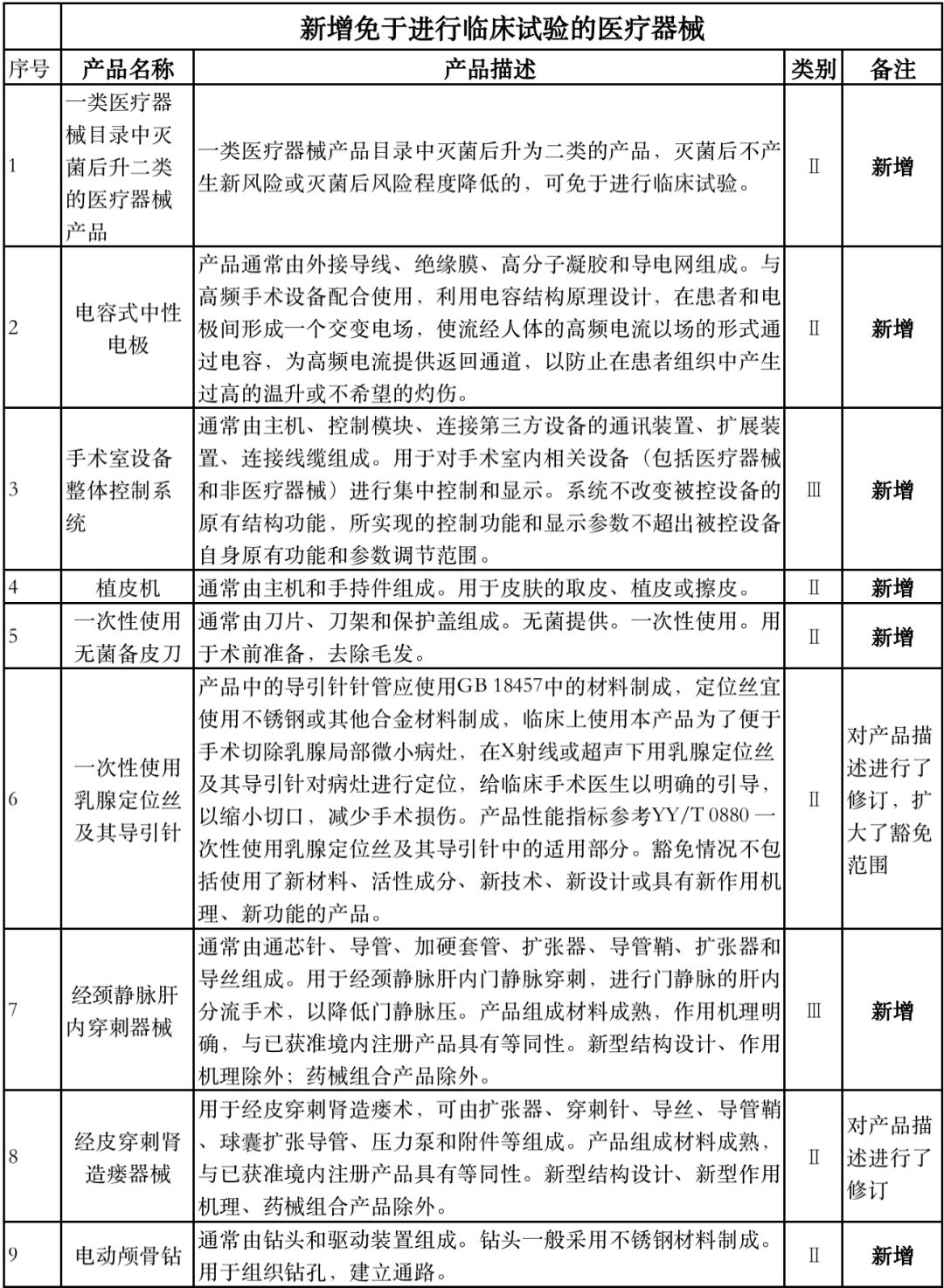 8月1日,国家药监局器审中心发布《免于进行临床试验医疗器械目录(2019年修订稿征求意见稿)》,共996种医疗器械和420种体外诊断试剂免于进行临床试验。 与2018版相比,2019版《豁免目录(意见稿)》新增142种医疗器械和27种体外诊断试剂,还对19种医疗器械扩大了豁免范围或对描述进行了修订,新增的142种医疗器械包括102种II类和40种III类医疗器械。
