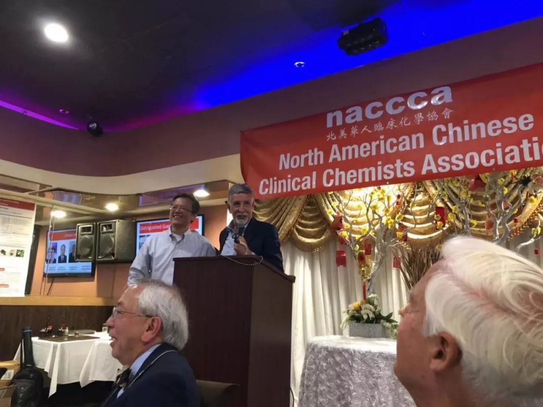 紧接着到颁奖环节,经过 NACCCA 董事会成员的严格遴选,对有贡献的前会长或业界杰出人士给予最佳贡献、服务和最佳教育等奖项。这些奖项旨用以认可他们为临检和体外诊断界做出的成绩和贡献。今年为NACCCA提供资助的企业有定向点金、西门子、KWORK、迈瑞、迈克生物、百创特生物等,对于这些企业的赞助支持,组委会和参会人员表示衷心的感谢。接下来,获奖人之一 Ruben Luo 博士做了 20 分钟精彩演讲。大家最喜欢和期待的餐后交流将会议引至高潮,大家互相交换名片、加微信。恭喜今年的成绩,互邀明年夏末芝加哥再聚!
