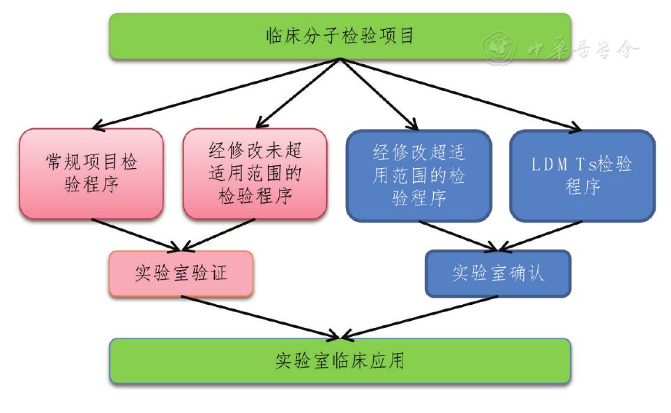 临床分子检验项目按照检测对象或目的可大致分为:感染性疾病分子检验项目、基因组相关疾病分子检验项目、肿瘤相关分子检验项目、用药指导分子检验项目和其他(移植配型、亲子鉴定、ABO血型核酸扩增定性检测)等。按照检测过程中采用的分子诊断技术可分为:PCR技术相关分子检验项目、Sanger测序技术相关分子检验项目、二代测序(next generation sequencing,NGS)技术相关分子检验项目、原位杂交技术相关分子检验项目等。此外,还可以分为需进行验证(Verification)的项目(常规项目和检验程序经修改未超适用范围的项目)和需进行确认(Validation)的项目[实验室自建分子检测项目(laboratory developed molecular tests,LDMTs)和检验程序经修改超适用范围的项目]两大类。临床分子检验项目无论怎样分类,无论哪一类临床分子检验项目,临床应用前其检验程序都需经过相应的方法学确认和/或验证,具体对应关系如图1所示。