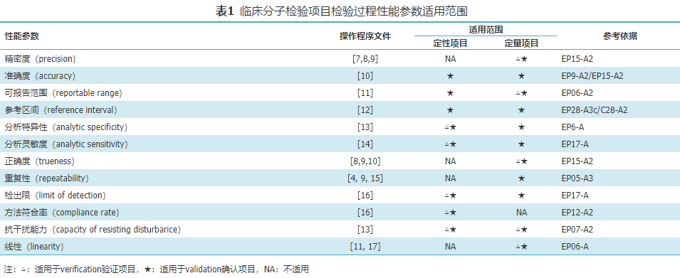 对于LDMTs或检验程序经修改超适用范围的项目须对现行检验程序进行确认。对于经批准准备临床开展的检验程序或检验程序经修改仍然在适用范围内的项目或发生影响检测系统分析性能的情况(如仪器故障、搬迁、设施环境严重失控等)须对现行检验程序进行验证。对于须确认的检验程序,因其项目涉及范围广、灵活多变,而导至确认实验复杂多变。其确认方案制定时需遵循以下几点:(1)资料收集:查阅公认的项目相关疾病的临床诊治指南、经典文献,以明确该分子检验项目技术背景、用途、实验步骤、质控和对照方法、样本类型和采集原则、TAT时间和报告形式等方面的信息。(2)选择性能参数:方法学确认的特点是应尽可能全面,其性能参数宜但不仅限于正确度、准确度、精密度、测量不确定度、分析特异性、分析灵敏度、抗干扰能力、检出限、可报告范围、参考范围等(具体方案选择见表1),临床敏感性、临床特异性为可选用的性能参数,实验室要求较高且样本数量较为容易收集的临床诊断项目可选择进行实验[4]。(3)确定判断标准:宜参考国标、行标、公开发表的指南和专家共识等合理制定实验室判定标准。对于须验证的检验程序,可按照CNAS制定的相关指南(如《分子诊断检验程序性能验证指南》)设计验证方案,性能参数具体方案选择见表1。实施验证或确认实验前需做如下准备:(1)人员:实施验证或确认实验的人员须为实验室具有相关资质的实验操作人员,其应该熟悉方法原理与操作(包括样品处理、校准、维护程序、质量控制),了解确认或验证方案;(2)环境:确保实验室设施及环境符合分析系统工作要求,仪器经校准并合格,确保检测系统工作状态正常;(3)样本:实验样本需经相关程序确认符合实验要求;(4)核酸提取效率评估:确认程序须对提取效率进行评价,以确保满足要求,验证程序须使用配套或生产制造商推荐的核酸提取试剂,必要时进行评价。其中,核酸提取效率评价宜包括:浓度,纯度和完整性。实验过程须严格遵照制定的验证或确认方案,依据样本检测程序进行。既定实验方案执行完毕后还需进行:(1)数据分析;(2)结果评价;(3)生成报告,所有涉及的性能参数结果和判定过程亦需包含于内,然后交由主任审核同意并签字生效。最后,临床分子检验项目检验程序的验证或确认完成后,需完善科室层面的生物安全内容、标准操作规程、人员培训计划、仪器相关事项、信息系统内容、能力验证计划等[5,6]。