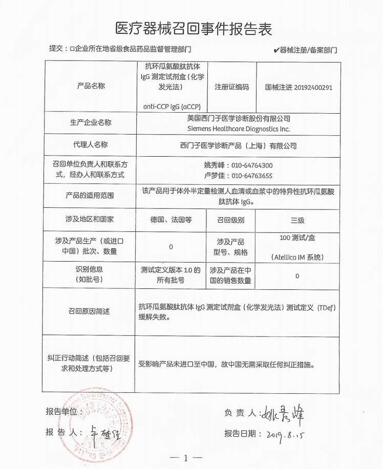 西门子医学诊断产品(上海)有限公司报告,由于涉及产品可能存在测试定义缓解失败的问题,生产商Siemens Healthcare Diagnostics Inc.对抗环瓜氨酸肽抗体IgG测定试剂盒(化学发光法)anti-CCP IgG(aCCP)(注册证号:国械注进20192400291)主动召回。召回级别为三级。涉及产品的型号、规格及批次等详细信息见《医疗器械召回事件报告表》。