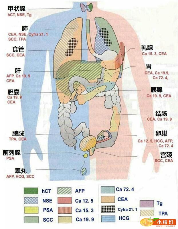 1、甲胎蛋白(AFP)AFP是胚胎期肝脏和卵黄囊合成的一种糖蛋白,在正常成人血循环中含量极微<20μg/L。AFP是诊断原发性肝癌的最佳标志物,诊断阳性率为60%~70%。血清AFP>400μg/L持续4周,或200~400μg/L持续8周者,结合影像检查,可作出原发性肝癌的诊断。急慢性肝炎,肝硬化患者血清中AFP浓度可有不同程度升高,其水平常<300ug/L。生殖胚胎性肿瘤(睾丸癌,畸胎瘤)可见AFP含量升高。 2、癌胚抗原(CEA) 癌胚抗原是从胎儿及结肠癌组织中发现的一种糖蛋白胚胎抗原,属于广谱性肿瘤标志物。血清CEA正常参考值<5μg/L。CEA在恶性肿瘤中的阳性率依次为结肠癌(70%)、胃癌(60%)、胰腺癌(55%)、肺癌(50%)、乳腺癌(40%)、卵巢癌(30%)、子宫癌(30%)。部分良性疾病直肠息肉,结肠炎,肝硬化,肺病疾病也有不同程度的CEA水平升高,但升高程度和阳性率较低。CEA属于粘附分子,是多种肿瘤转移复发的重要标志。3、癌抗原125(CA125)CA125存在于上皮卵巢癌组织和病人血清中,是研究最多的卵巢癌标记物,在早期筛查、诊断、治疗及预后的应用研究均有重要意义。CA125对卵巢上皮癌的敏感性可达约70%。其他非卵巢恶性肿瘤(宫颈癌、宫体癌、子宫内膜癌、胰腺癌、肺癌、胃癌、结/直肠癌、乳腺癌)也有一定的阳性率。良性妇科病(盆腔炎、卵巢囊肿等)和早期妊娠可出现不同程度的血清CA125含量升高。 4、癌抗原15-3(CA15-3)CA15-3可作为乳腺癌辅助诊断,术后随访和转移复发的指标。对早期乳腺癌的敏感性较低(60%),晚期的敏感性为80%,转移性乳腺癌的阳性率较高(80%)。其他恶性肿瘤也有一定的阳性率,如:肺癌、结肠癌、胰腺癌、卵巢癌、子宫颈癌、原发性肝癌等。 5、糖类抗原19-9(CA19-9)CA19-9是一种与胃肠道癌相关的糖类抗原,通常分布于正常胎儿胰腺、胆囊、肝、肠及正常成年人胰腺、胆管上皮等处。检测患者血清CA19-9可作为胰腺癌、胆囊癌等恶性肿瘤的辅助诊断指标,对监测病情变化和复发有很大意义。胃癌、结/直肠癌、肝癌、乳腺癌、卵巢癌、肺癌等患者的血清CA19-9水平也有不同程度的升高。某些消化道炎症CA19-9也有不同程度的升高,如:急性胰腺炎、胆囊炎、胆汁淤积性胆管炎、肝炎、肝硬化等。 6、癌抗原50(CA50)CA50是胰腺和结、直肠癌的标志物,是最常用的糖类抗原肿瘤标志物,因其广泛存在胰腺、胆囊、肝、胃、结直肠、膀胱、子宫,它的肿瘤识别谱比CA19-9广,因此它又是一种普遍的肿瘤标志相关抗原,而不是特指某个器官的肿瘤标志物。CA50在多种恶性肿瘤中可检出不同的阳性率,对胰腺癌和胆囊癌的阳性检出率居首位,占94.4%;其它依次为肝癌(88%)、卵巢与子宫癌(88%)和恶性胸水(80%)等。可用于胰腺癌、胆囊癌等肿瘤的早期诊断,对肝癌、胃癌、结直肠癌及卵巢肿瘤诊断亦有较高价值。 7、糖类抗原242(CA242)CA242是与胰腺癌、胃癌、大肠癌相关的糖脂类抗原。血清CA242用于胰腺癌,大肠癌的辅助诊断,有较好的敏感性(80%)和特异性(90%)。肺癌,肝癌,卵巢癌患者的血清CA242含量可见升高。 8、胃癌相关抗原(CA72-4)CA72-4是目前诊断胃癌的最佳肿瘤标志物之一,对胃癌具有较高的特异性,其敏感性可达28-80%,若与CA19-9及CEA联合检测可以监测70%以上的胃癌。CA72-4水平与胃癌的分期有明显的相关性,一般在胃癌的Ⅲ-Ⅳ期增高,对伴有转移的胃癌病人,CA72-4的阳性率更远远高于非转移者。CA72-4水平在术后可迅速下降至正常。在70%的复发病例中,CA72-4浓度首先升高。与其它标志物相比,CA72-4最主要的优势是其对良性病变的鉴别诊断有极高的特异性,在众多的良性胃病患者中,其检出率仅0.7%。结/直肠癌、胰腺癌、肝癌、肺癌、乳腺癌、卵巢癌也有一定的阳性率。 9、铁蛋白(SF)铁蛋白升高可见于下列肿瘤:急性白血病、何杰金氏病、肺癌、结肠癌、肝癌和前列腺癌。检测铁蛋白对肝脏转移性肿瘤有诊断价值,76%的肝转移病人铁蛋白含量高于400μg/L,当肝癌时,AFP测定值较低的情况下,可用铁蛋白测定值补充,以提高诊断率。在色素沉着、炎症、肝炎时铁蛋白也会升高。升高的原因可能是由于细胞坏死,红细胞生成被阻断或肿瘤组织中合成增多。 10、前列腺特异抗原(PSA)PSA是由人前列腺上皮细胞合成并分泌至精浆中的一种糖蛋白,PSA主要存在于前列腺组织中,女性体内不存在,正常男性血清中PSA的含量很低,血清参考值<4μg/L;PSA具有器官特异性,但不具有肿瘤特异性。诊断前列腺癌的阳性率为80%。良性前列腺疾病也可见血清PSA水平不同程度升高。血清PSA测定是前列腺癌术后复发转移和疗效观察的监测指标。在血液中以两种形式存在:结合PSA和游离PSAF-PSA/T-PSA比值是鉴别前列腺癌和良性前列腺疾病的有效指标。F-PSA/T-PSA>0.25多为良性疾病;F-PSA/T-PSA<0.16高度提示前列腺癌。 11、前列腺酸性磷酸酶(PAP)前列腺癌血清PAP升高,是前列腺癌诊断、分期、疗效观察及预后的重要指标。前列腺炎和前列腺增生PAP也有一定程度的增高。 12、β2微球蛋白(β2-MG)β2微球蛋白(β2-microglobulin,β2-m)表达在大多数有核细胞表面。临床上多用于诊断淋巴增殖性疾病,如白血病、淋巴瘤及多发性骨髓瘤。其水平与肿瘤细胞数量、生长速率、预后及疾病活动性有关。此外,根据此水平还可用于骨髓瘤患者分期。血清β2-MG可以在肾功能衰竭、炎症及多种疾病中均可增高。故应排除由于某些炎症性疾病或肾小球滤过功能减低所致的血清β2-MG增高。 13、神经元特异