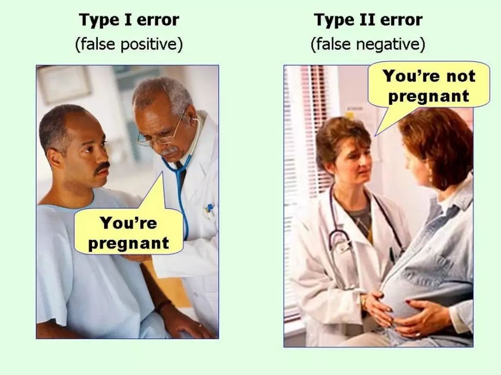 我们用一个生动形象的例子来详细讲一下: 零假设(H0):病人没有怀孕。 备择假设(H1):病人怀孕。 在下图中,我们可以看到,左侧的男性病人不可能怀孕(当然是指自然状态下),但医生却认为病人怀孕,这就是当零假设是真实的却拒绝了零假设,犯了I类错误;而右侧的女性病人,可以看到其怀孕,但是医生却认为病人没有怀孕,这就是零假设不成立却接受了零假设,犯了II类错误。是不是很形象呢?如果还是不理解,请参考“统计方法套路深,细说I类错误和II类错误!”。 (图片来源:flowingdata.com)